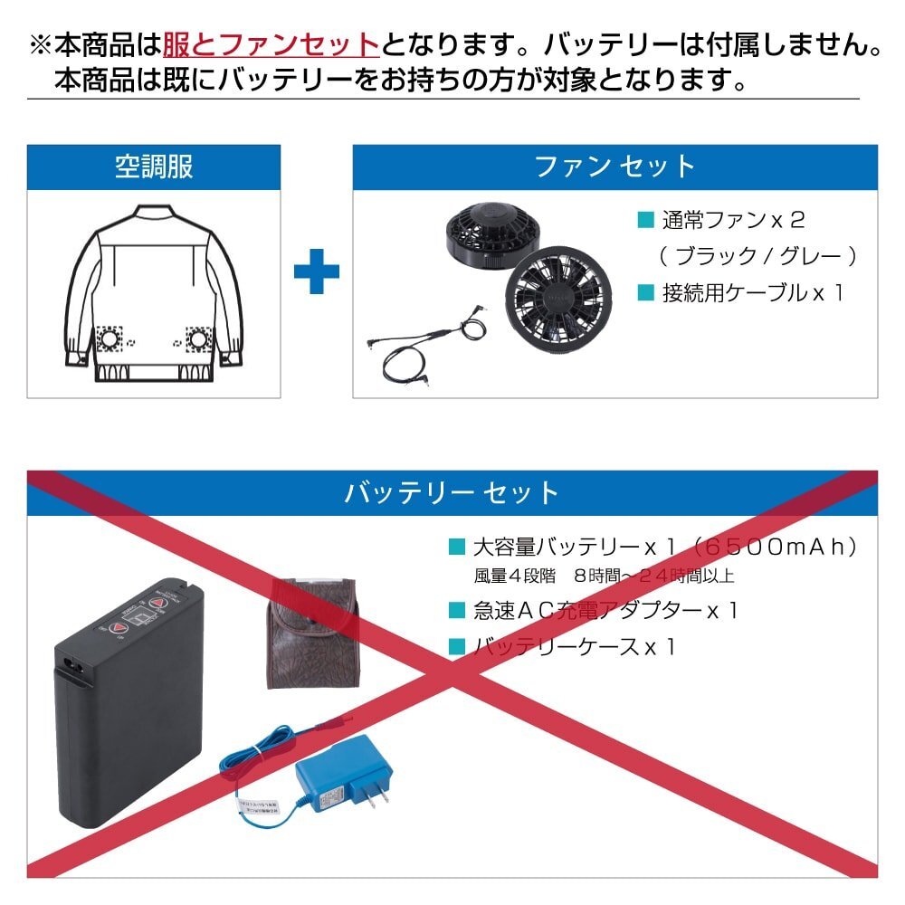 | 注意事項 | ※本商品はお支払確定後、約3~4日後出荷となりますのでご了承下さい。 ※本商品は服とファンセットとなります。 バッテリーは付属しておりません。 ※炎天下の車内等(高温の場所)に放置しないよう、ご注意ください。 羽が折れる可能性があるため、エアーガンによるファンの清掃は行わないでください。 専用バッテリー以外は使用しないでください。故障や事故の原因になります。 この素材は火気に弱い素材なので、火気を扱う現場では着用しないでください。 ※本商品の性質上、ごく稀にご希望商品が無い場合が御座います。その際は申し訳ございませんがご容赦下さいませ。 | 返品・交換 | ※本商品の性質上、返品・交換不可となりますので予めご了承下さい。(初期不良・弊社不備の場合は、商品到着後一週間以内は返品・交換可能) ※返品・交換詳細はコチラのご利用案内をご覧下さい。 |