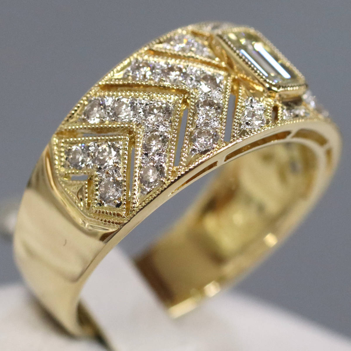 K18ダイヤモンドリングの中古品です。 エメラルドカットの施された照り良く輝くイエローダイヤモンドの中石が目を引きます。 脇石のダイヤモンドはかすかに黄味がかっておりますが無色に近いお色味です。 インクルージョンがあるものの、肉眼ではわかりません。 ルーペで見ると地金にサイズ直しの跡やスレ傷、あたり傷が見られ、使用感があります。