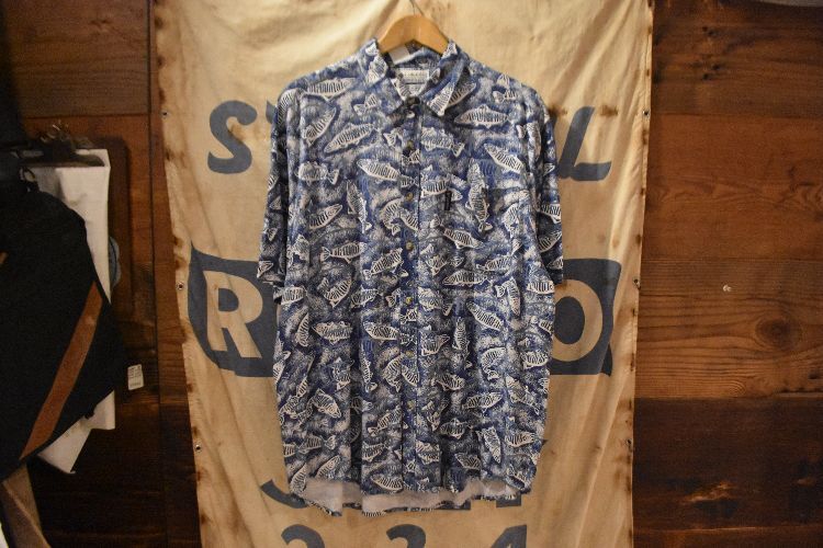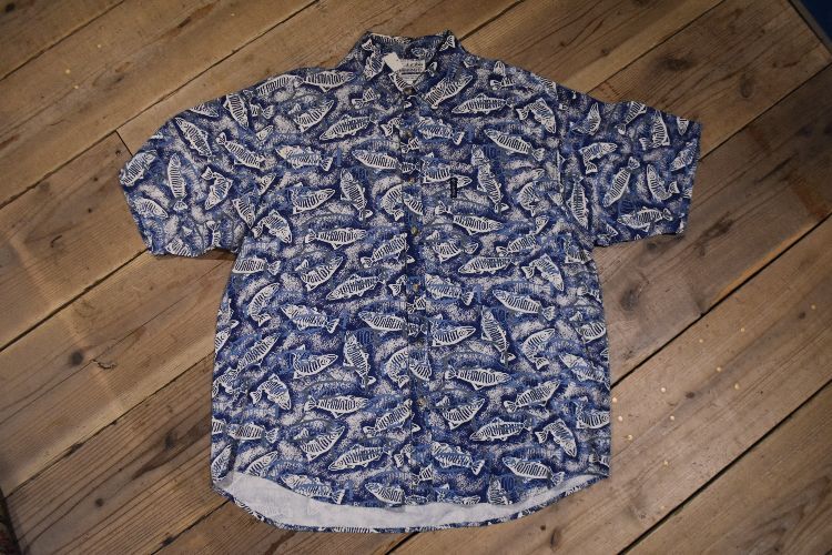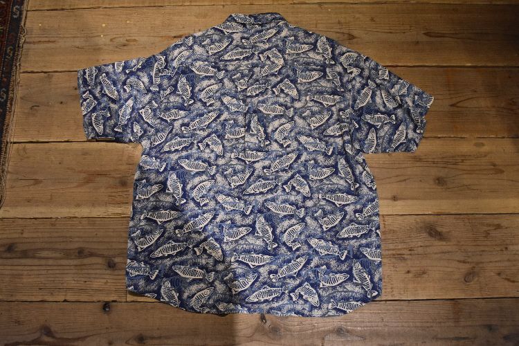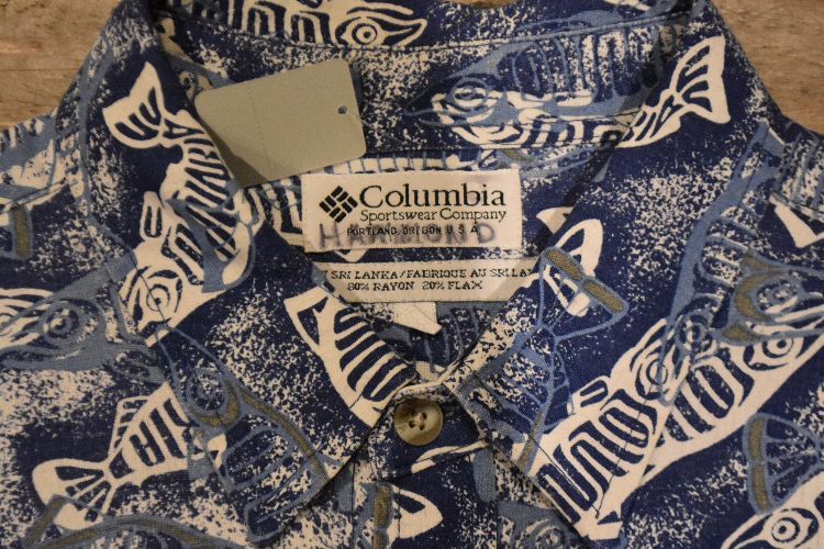 グッドスタイル◎90sビンテージColumbiaコロンビア半袖総柄シャツLマルチカラーアメカジストリートアウトドアアロハRAYON&FLAX w795