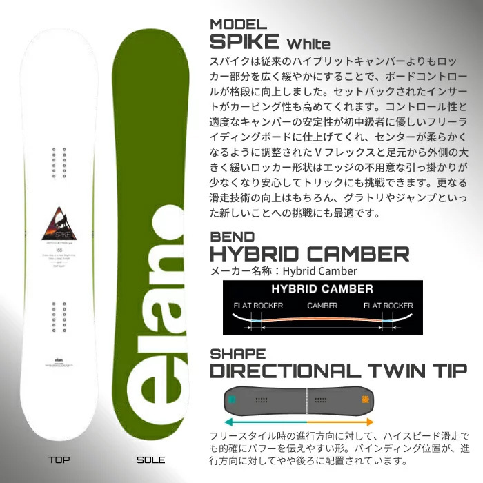 スパイクは従来のハイブリットキャンバーよりもロッカー部分を広く緩やか にすることで、ボードコントロールが格段に向上しました。セットバックされ たインサートがカービング性も高めてくれます。コントロール性と適度なキ ャンバーの安定性が初中級者に優しいフリーライディングボードに仕上げ てくれ、センターが柔らかくなるように調整されたVフレックスと足元から外 側の大きく緩いロッカー形状はエッジの不用意な引っ掛かりが少なくなり 安心してトリックにも挑戦できます。更なる滑走技術の向上はもちろん、グラ トリやジャンプといった新しいことへの挑戦にも最適です。