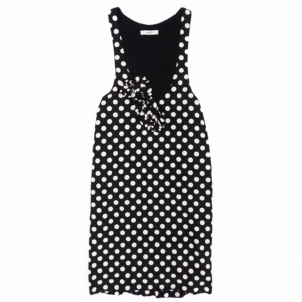 | 【INGEBORG インゲボルグ ドット柄 ジャンパースカート ワンピース ロング丈 ピコフリル リボン付き 黒白 レディース】 | |