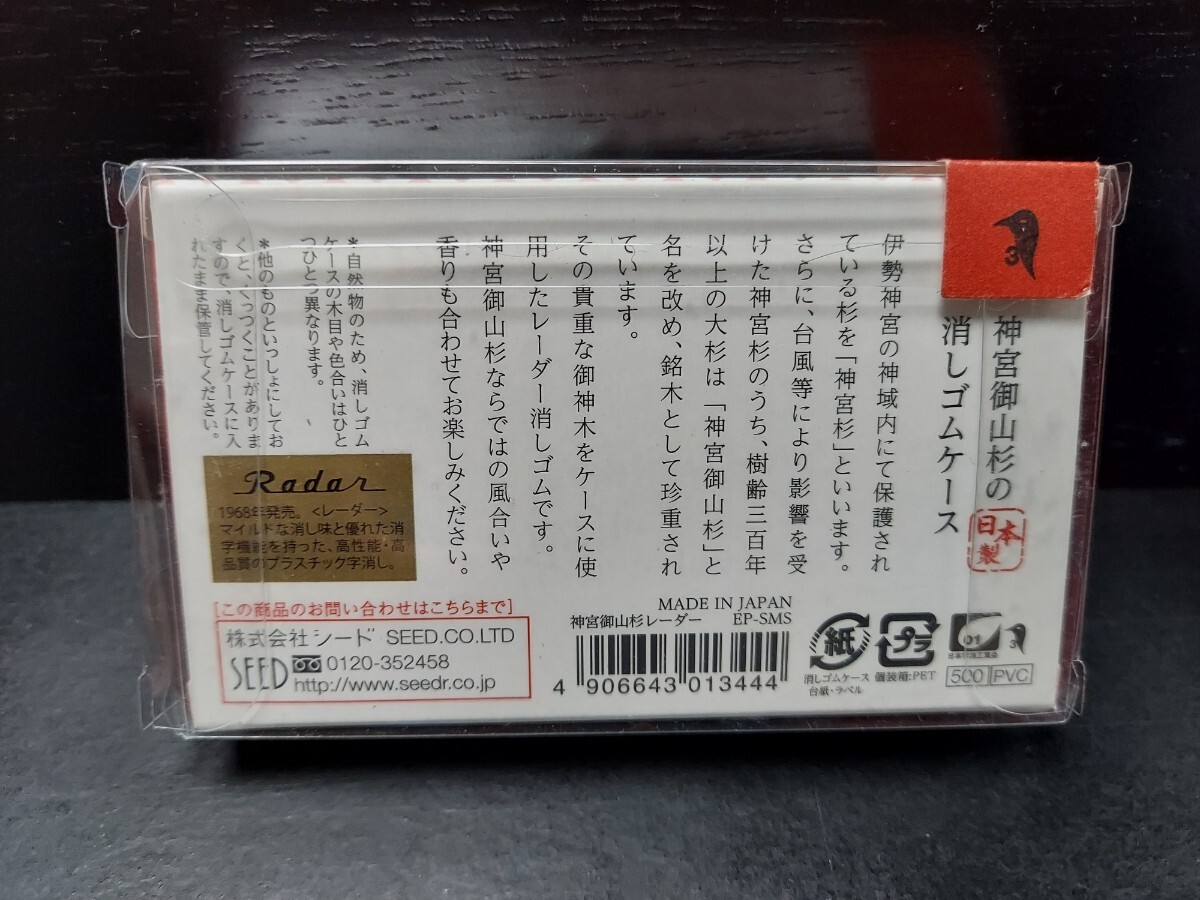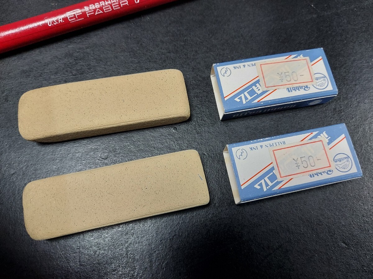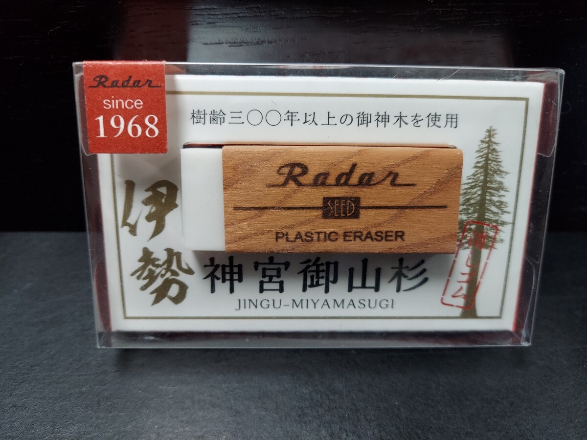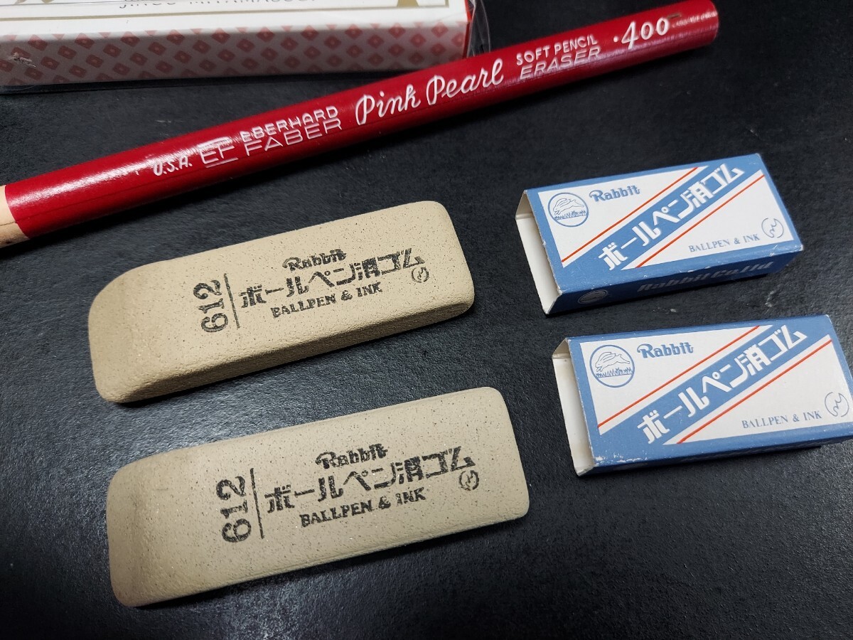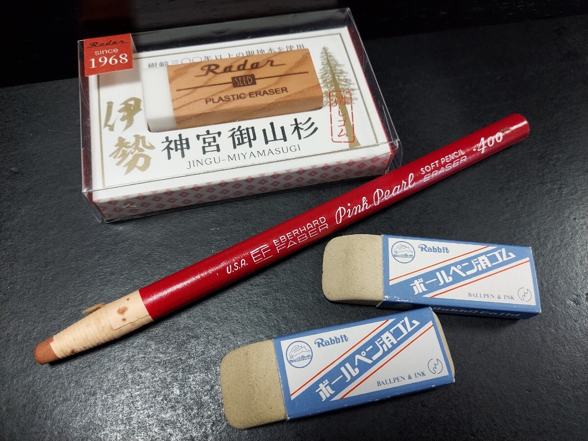 Faber-CastellのPink Pearl消しゴムとRabbitの612ボールペン消しゴムとレーダーSEEDの神宮御山杉 御神木消しゴム