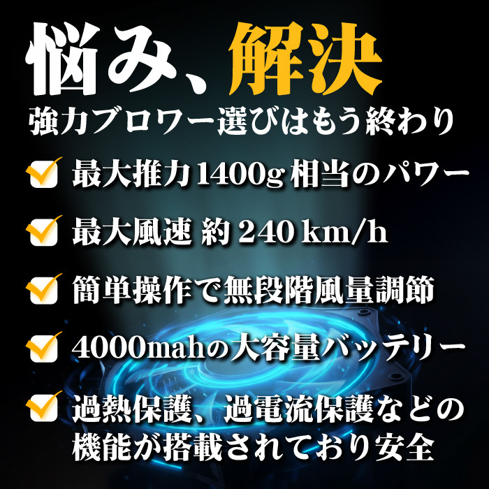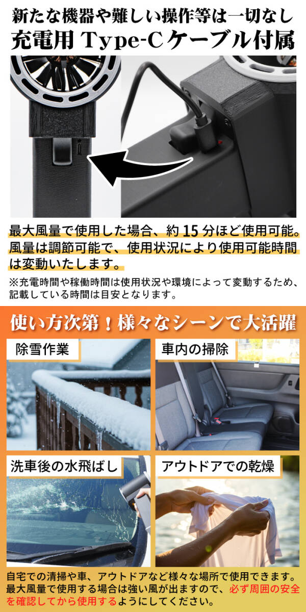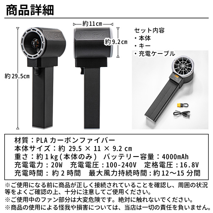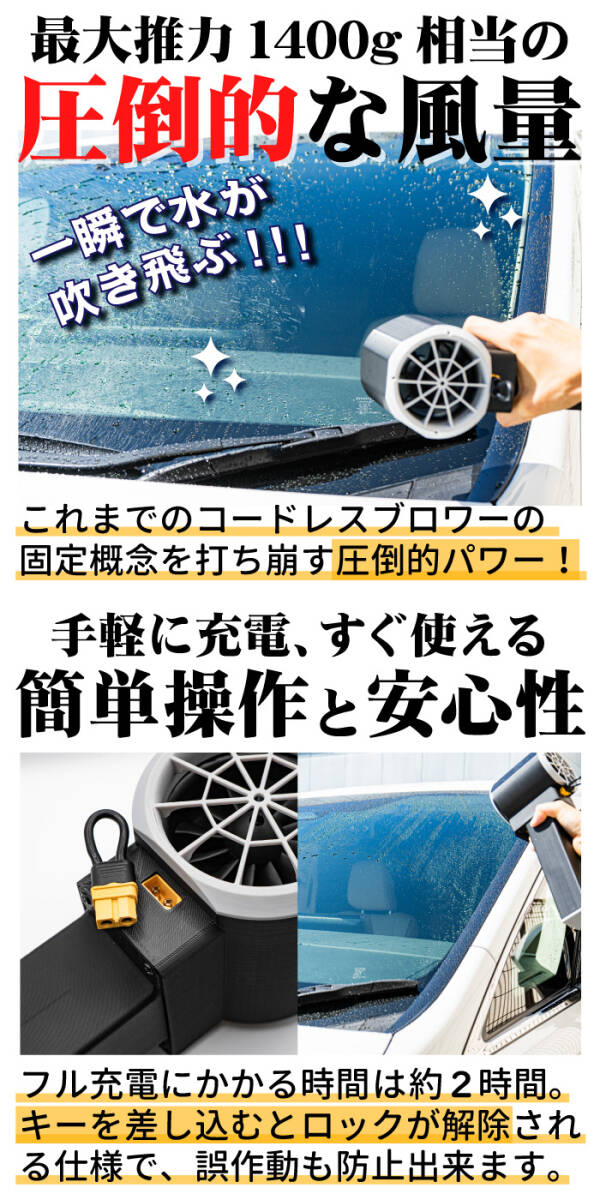 | 本当にこの風量でコードレス!?ハイパワーの強力ブロワー! コードレスのブロワーといえばホコリが飛ばせる程度で…野外などでは中々使えない… そんな常識をぶち壊す!無段階風量調整可能のターボファンで ホコリやゴミだけじゃなく、洗車後の水飛ばしだって余裕のハイパワー! 操作は超簡単!充電が完了したらキーを差し込むとロックが解除され あとはボタンを押すだけ!面倒な操作などはありません。風量もボタンの押し具合で調節が可能! コードレスなので、家の中でも外でも使用可能!アウトドアに1台持って行くだけで様々なことに大活躍! ■セット内容:本体/キー/充電ケーブル ■本体サイズ:約29.5cm×約11cm×約9.2cm ■製品重量:約1kg ■最大風速:240km/h ■バッテリー容量:4000mAh ■充電電力:20W ■充電電圧:100-240V ■定格電圧:16.8V ■充電時間:約2時間 ※ご使用になる前に商品が正しく接続されていることを確認し、周囲の状況等をよくご確認の上、十分に注意してご使用ください。 ※ご使用中のファン部分は大変危険です。絶対に触れないでください。 ※商品の使用による怪我や損害については、当店は一切の責任を負いません。 ※イメージ違いではご返品不可となります。 |