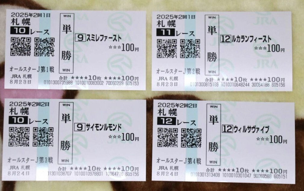 2025 ワールドオールスタージョッキーズ 北村友一ジョッキーセット (2025年8/23・24) 現地単勝馬券(札幌競馬場) ウィルサヴァイブ ルカランファースト スミレファースト サイモンルモンドです。気に入って頂けた方の落札を心よりお待ちしております。 商品はゆうパケットポストで発送となります。どうかよろしくお願い致します。※〇北村友一ジョッキー騎乗馬券 ウィルサヴァイブ ルカランファースト スミレファースト サイモンルモンド