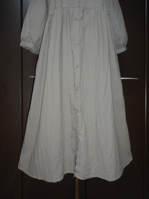 未使用タグ付。ベージュ茶上身刺繍W上ギャザー切替7分袖OP