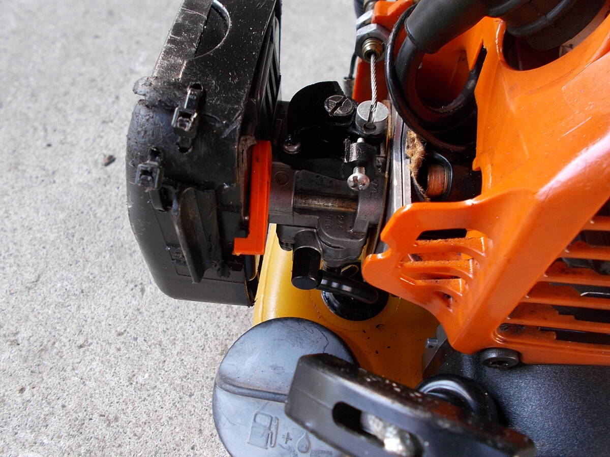 エンジンは21cc程度で始動性も良く低速から高速までスムースに吹け上がります。ツーグリップ仕様です。古い機械ですが今でも圧縮は強く火花も良く出ています。