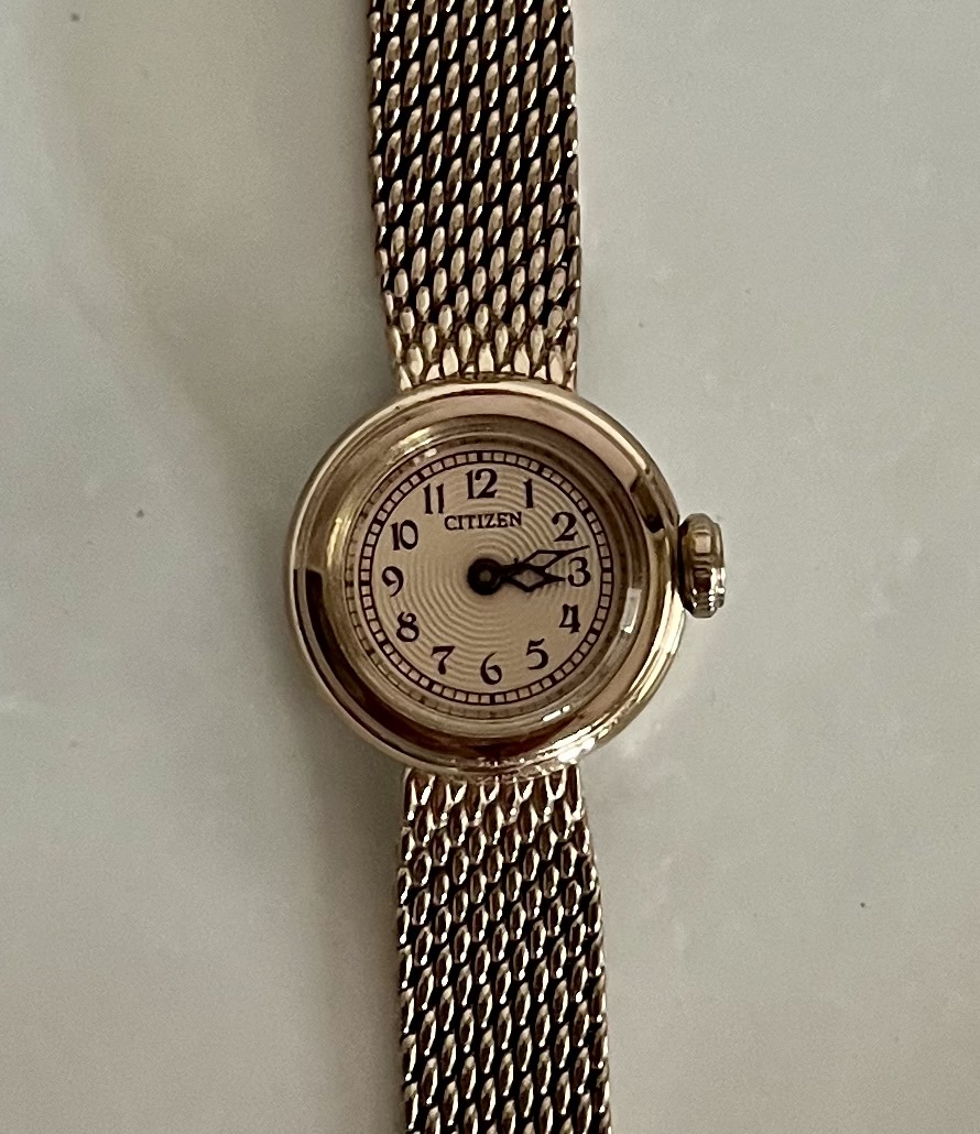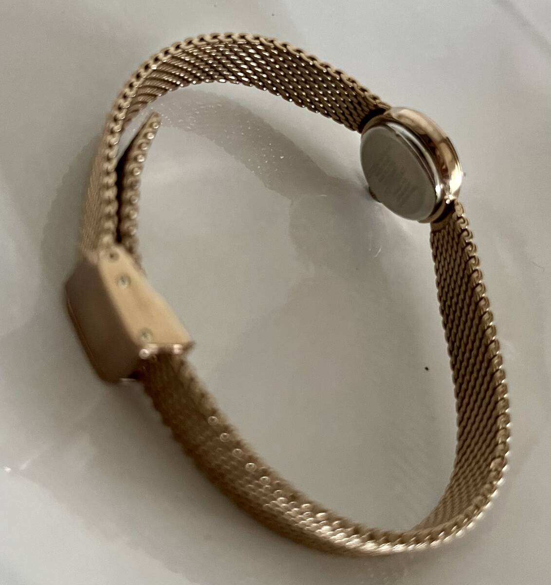 小さな文字盤と、細いピンクゴールドカラーのブレスレットが華奢で控えめなのに印象的でとても素敵です。