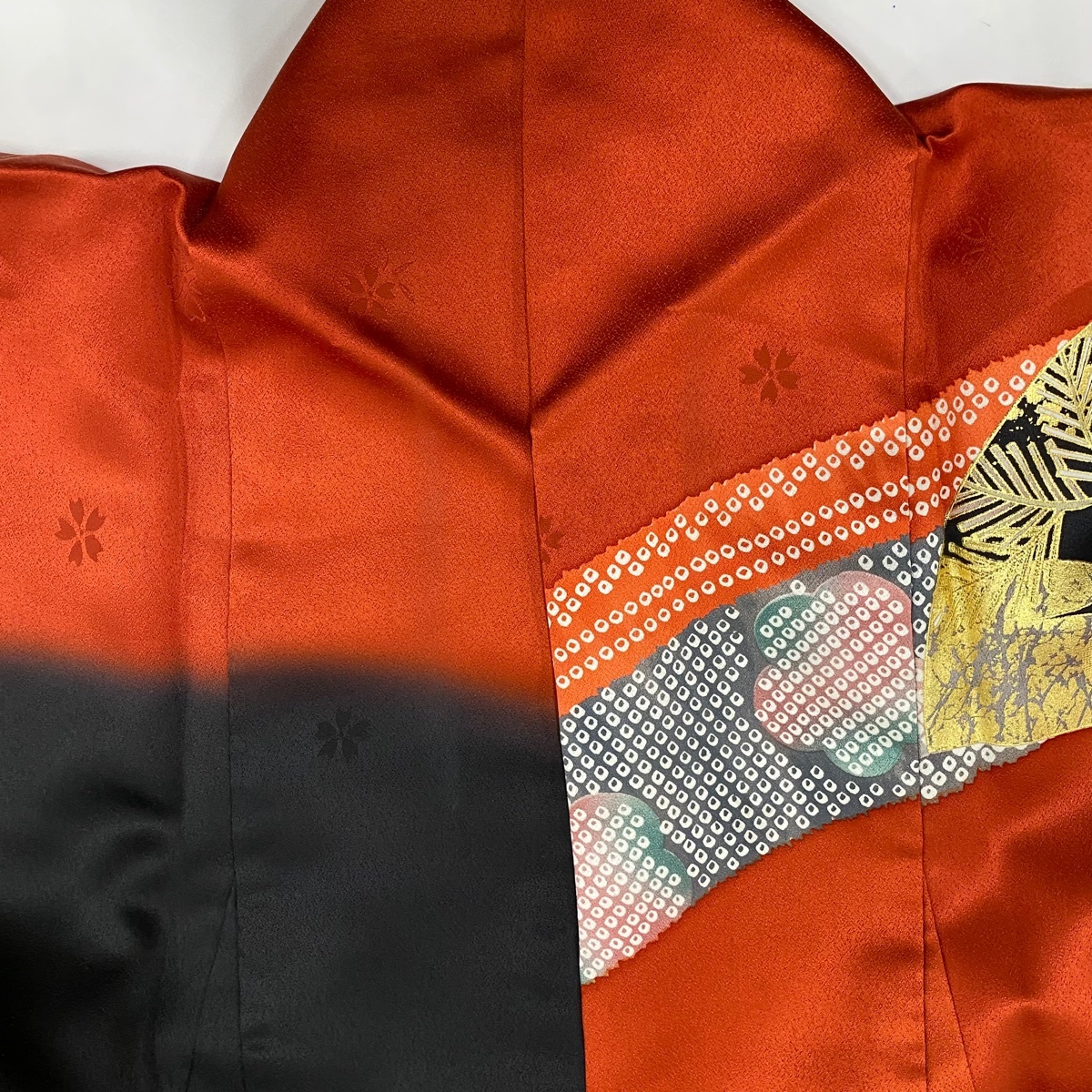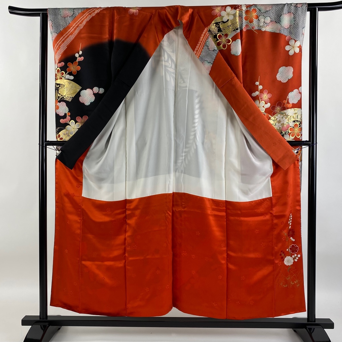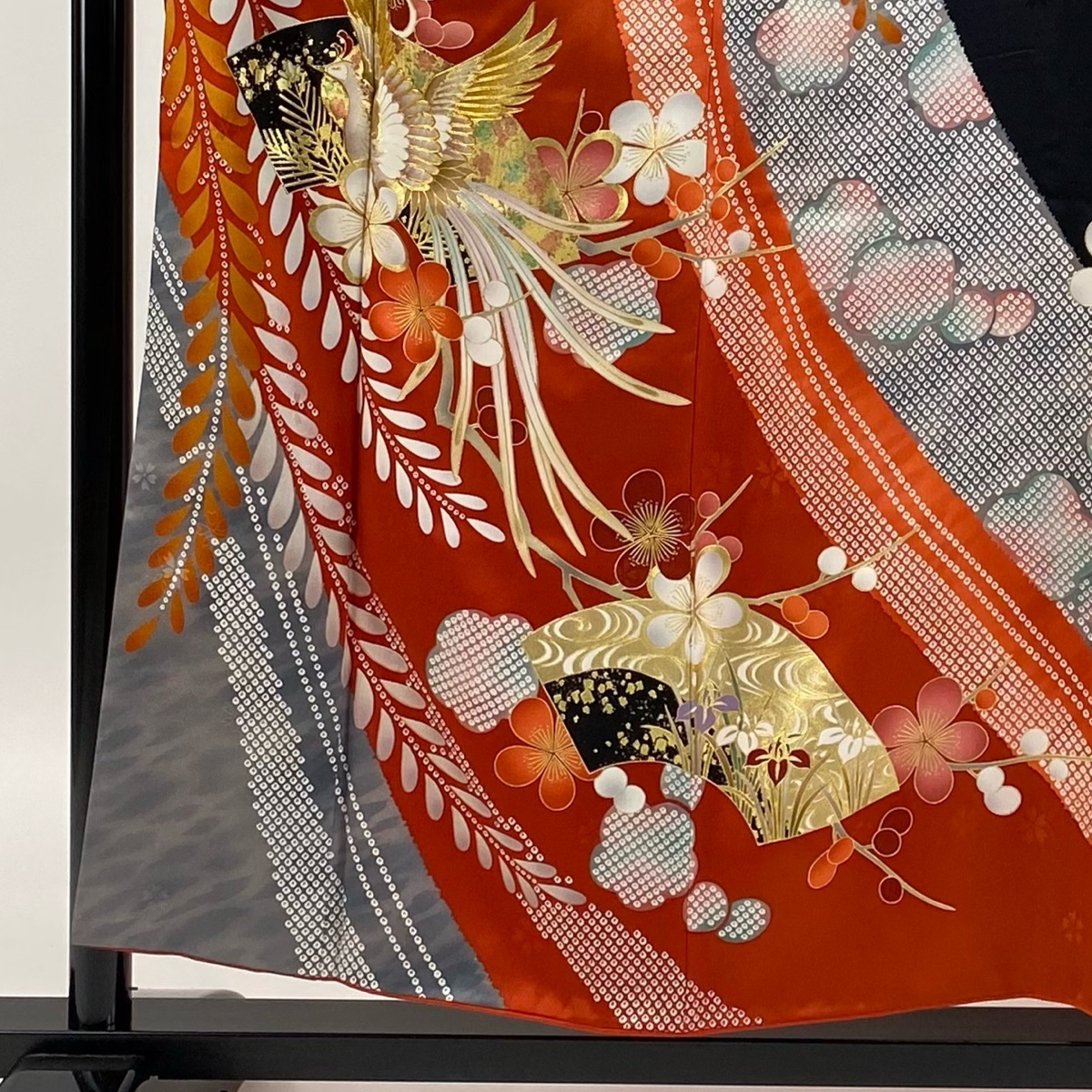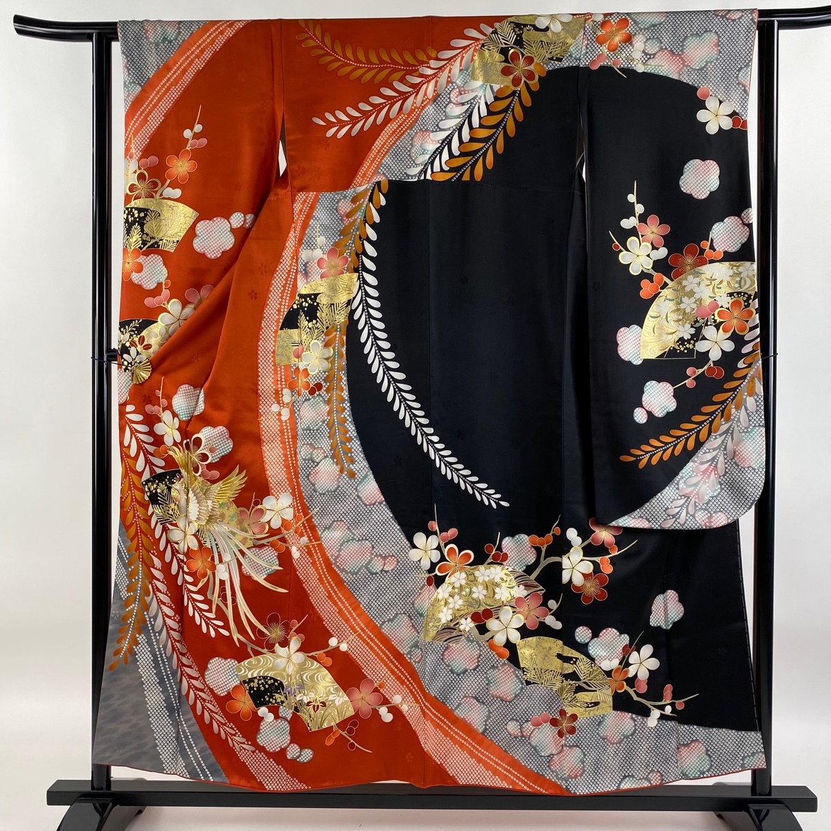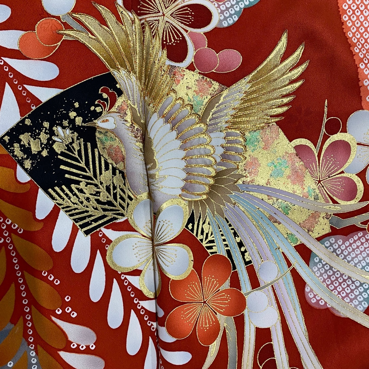 | 振袖 秀品 尾長鳥 扇面 金糸 金彩 茜色 袷 身丈154 裄丈62 S 正絹 【中古】 |