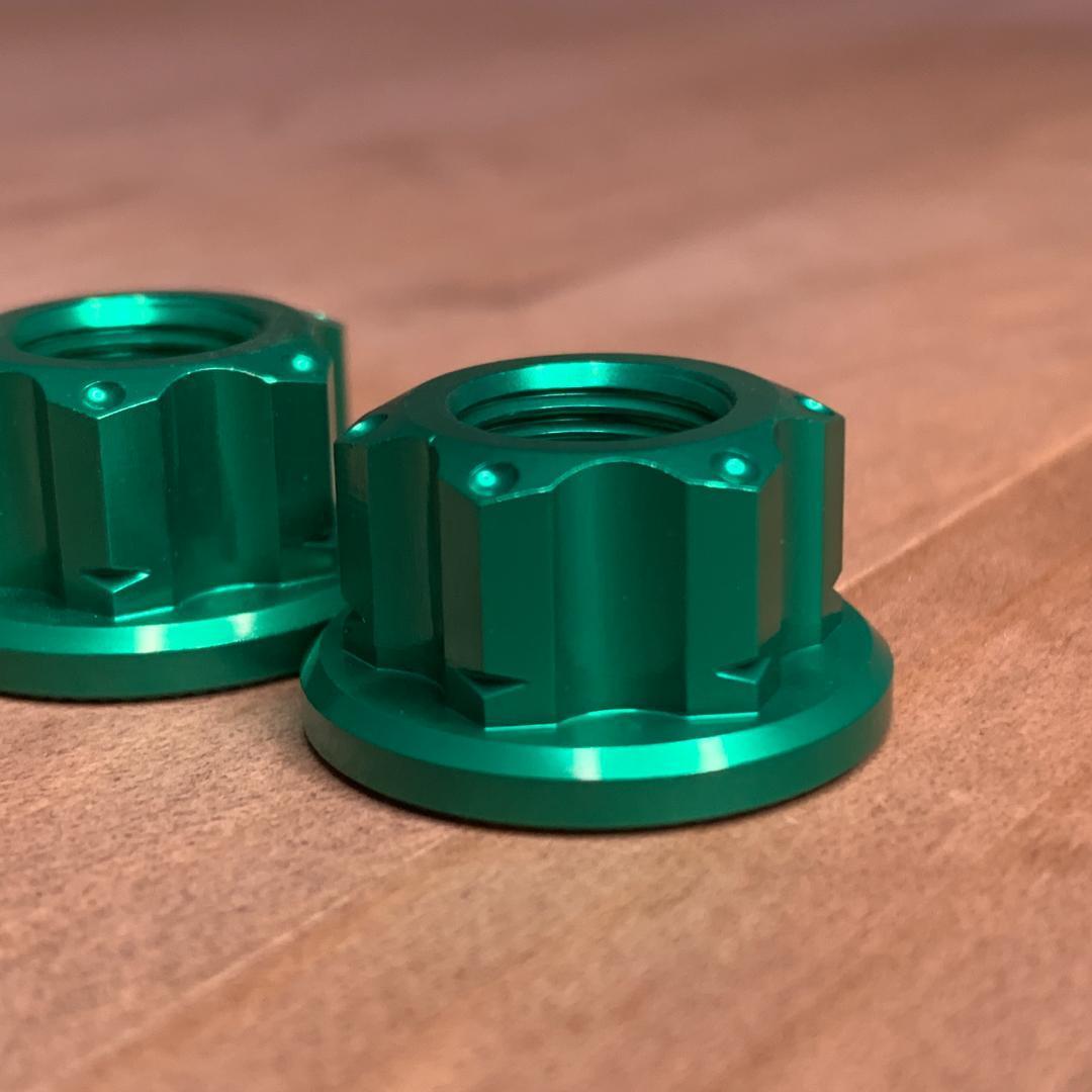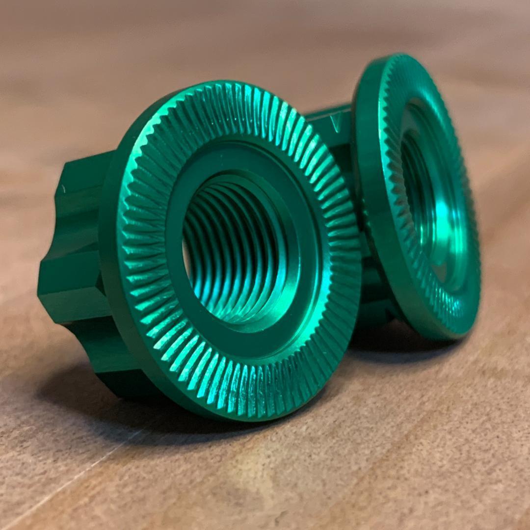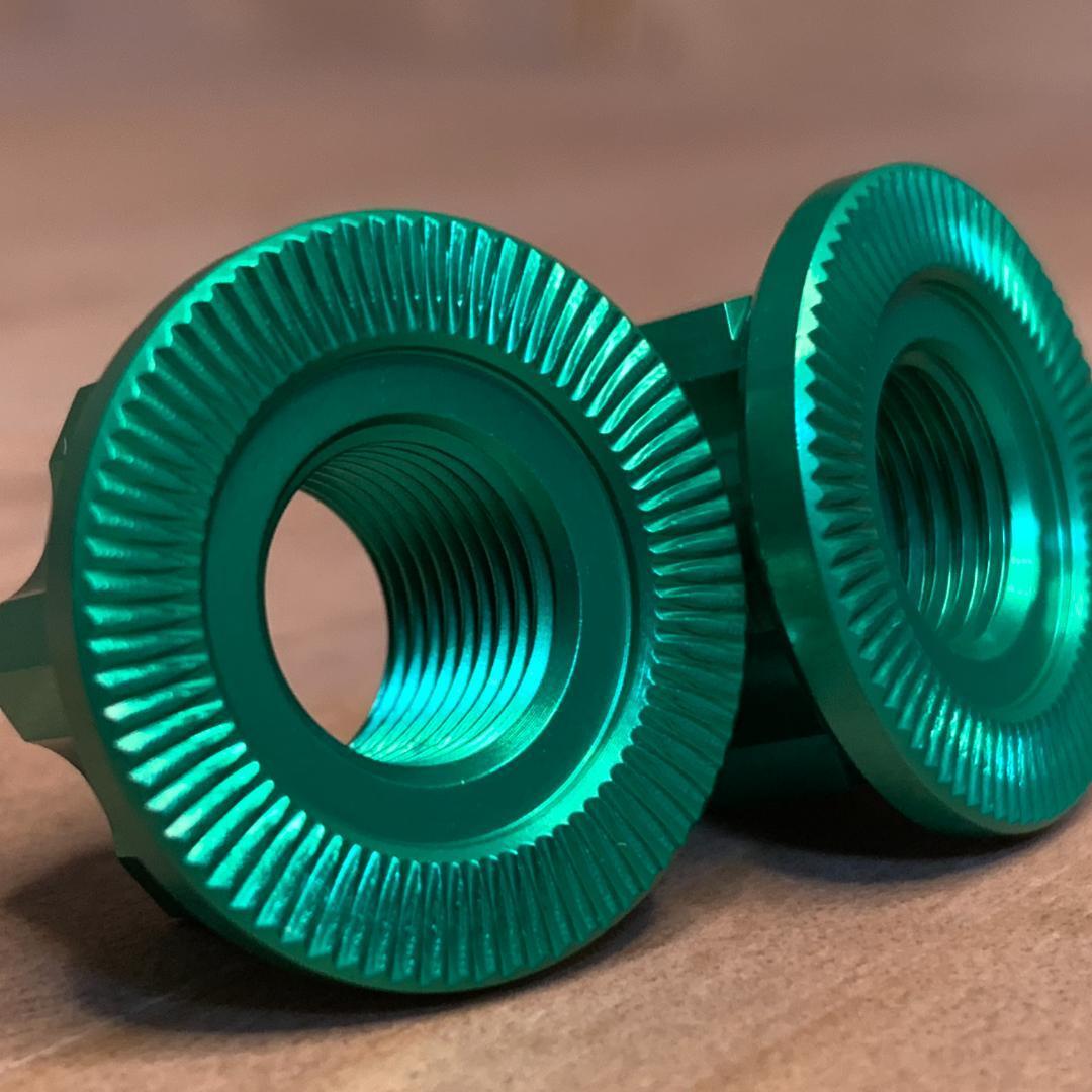 自転車のフロントホイールを固定する、アルミ合金製ハブナットです。軽量かつカラフルなデザインで、ピストバイクやナット留めのクロスバイクの足元をスタイリッシュにカスタムします。