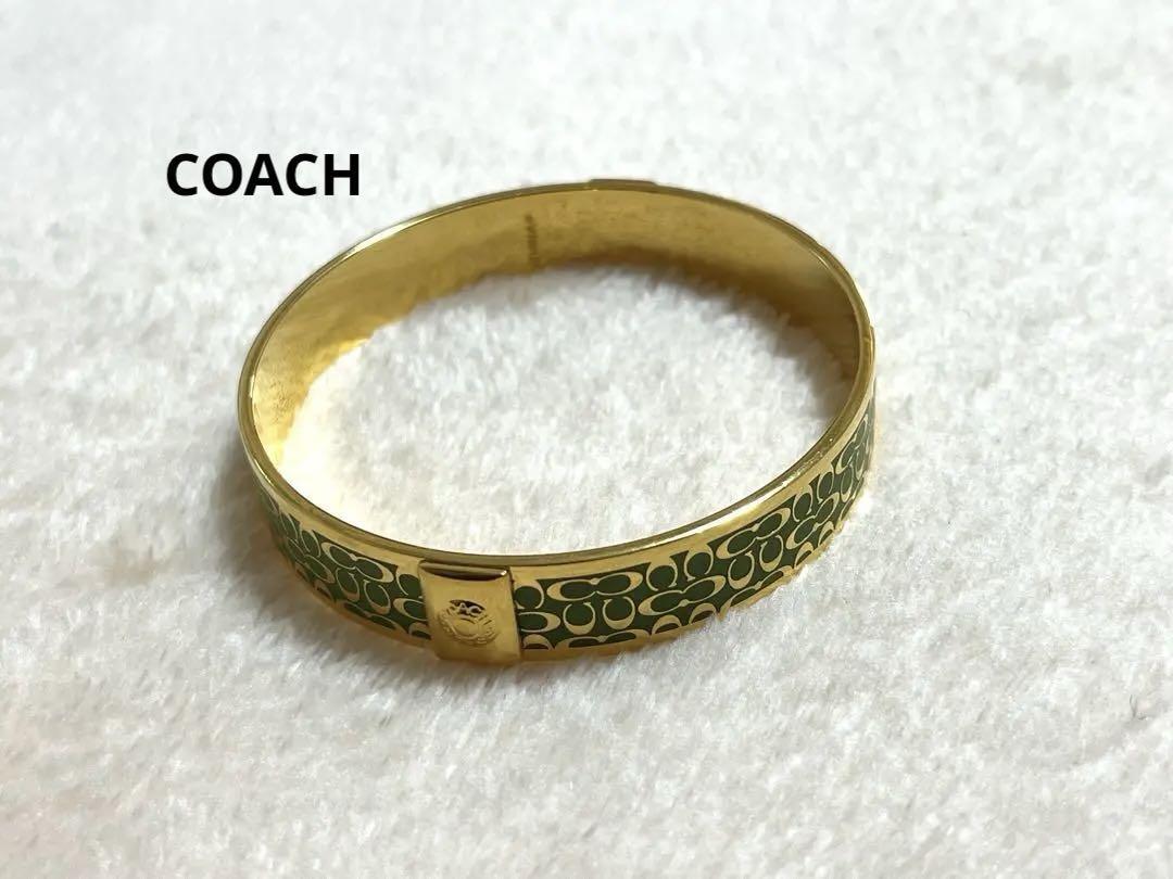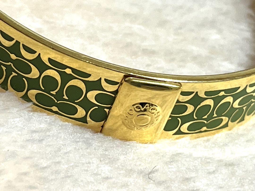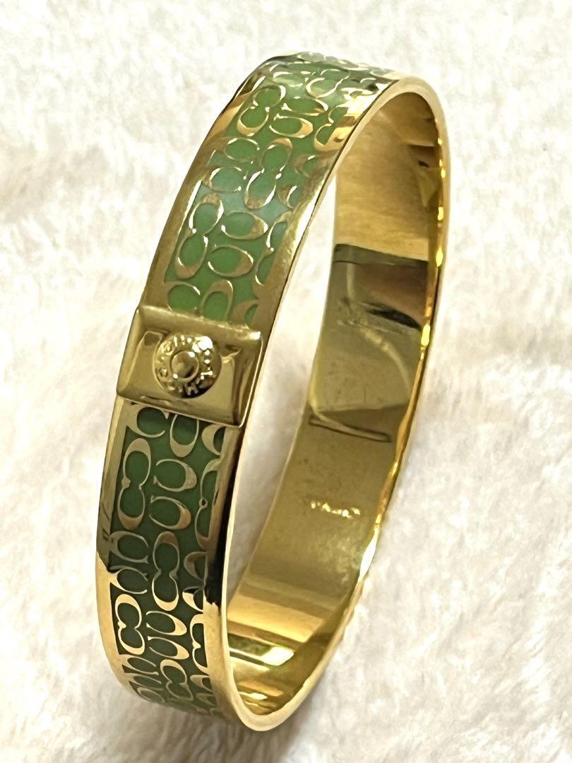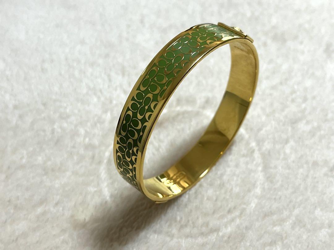 ゴールドカラーの金属に、コーチを象徴するシグネチャー柄がグリーンのエナメルであしらわれたデザイン。