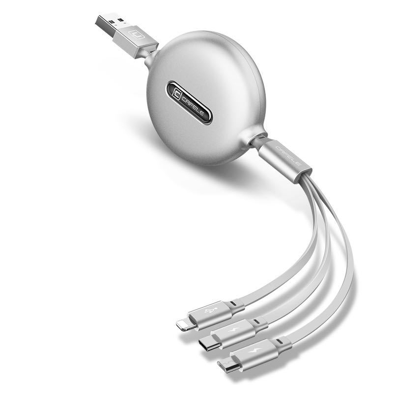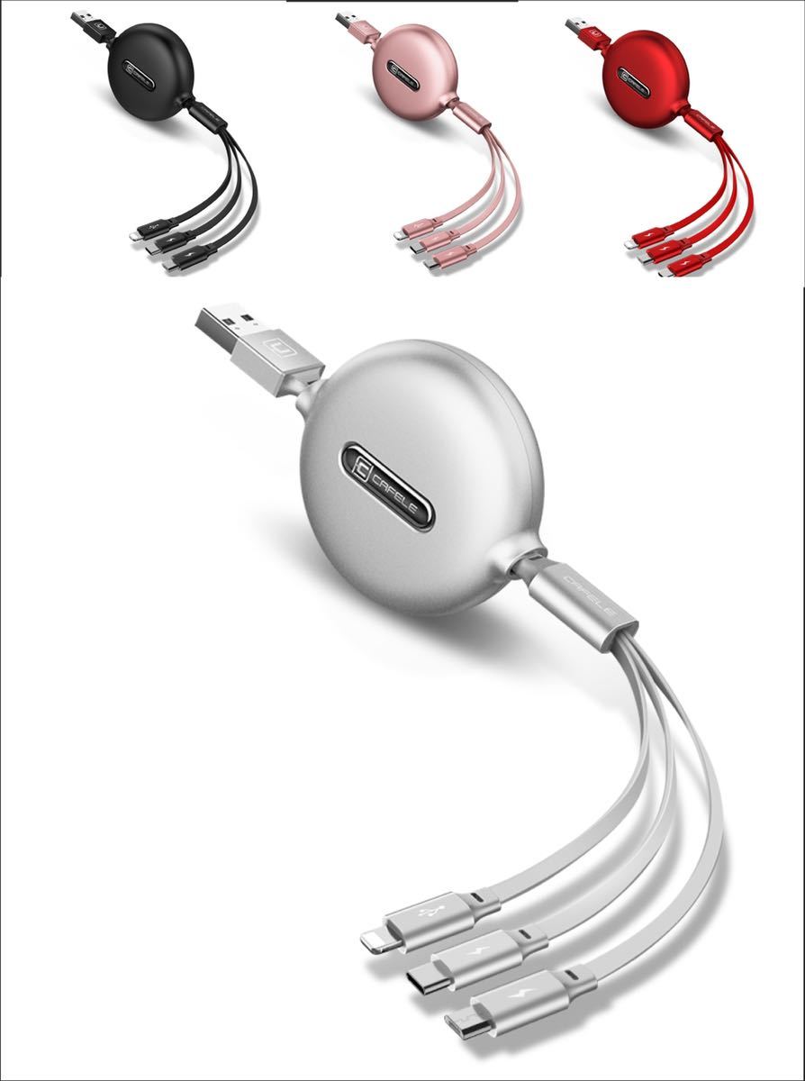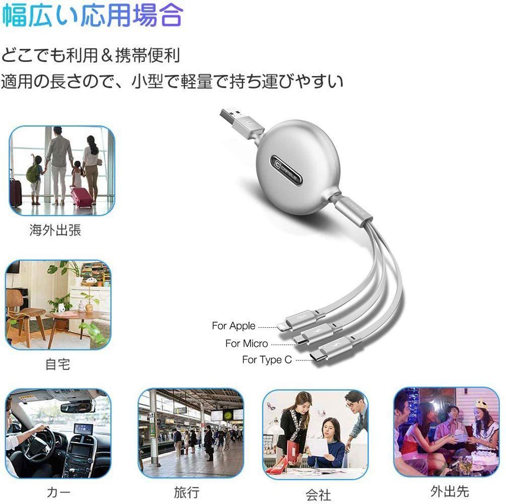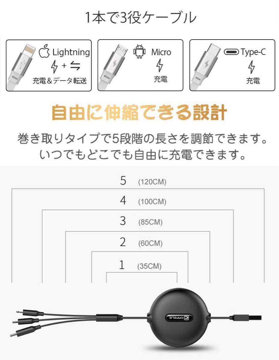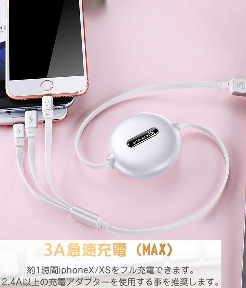 巻き取り式 3in1 高品質 充電ケーブル iPhone Type-C Android対応ケーブル同時充電可 高速充電 データ転送(Lightningのみ) 長さ1.2m 120cm (黒、白、赤、ピンク4色がございます)