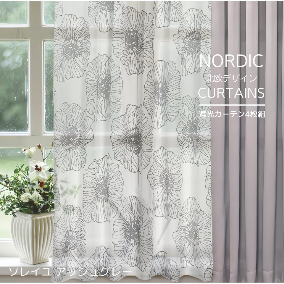 [柄/カラー] ソレイユ/アッシュグレー [サイズ] 遮光カーテン:幅100×丈135㎝2枚+ レース:幅100×丈133㎝2枚の合計4枚 | ||||