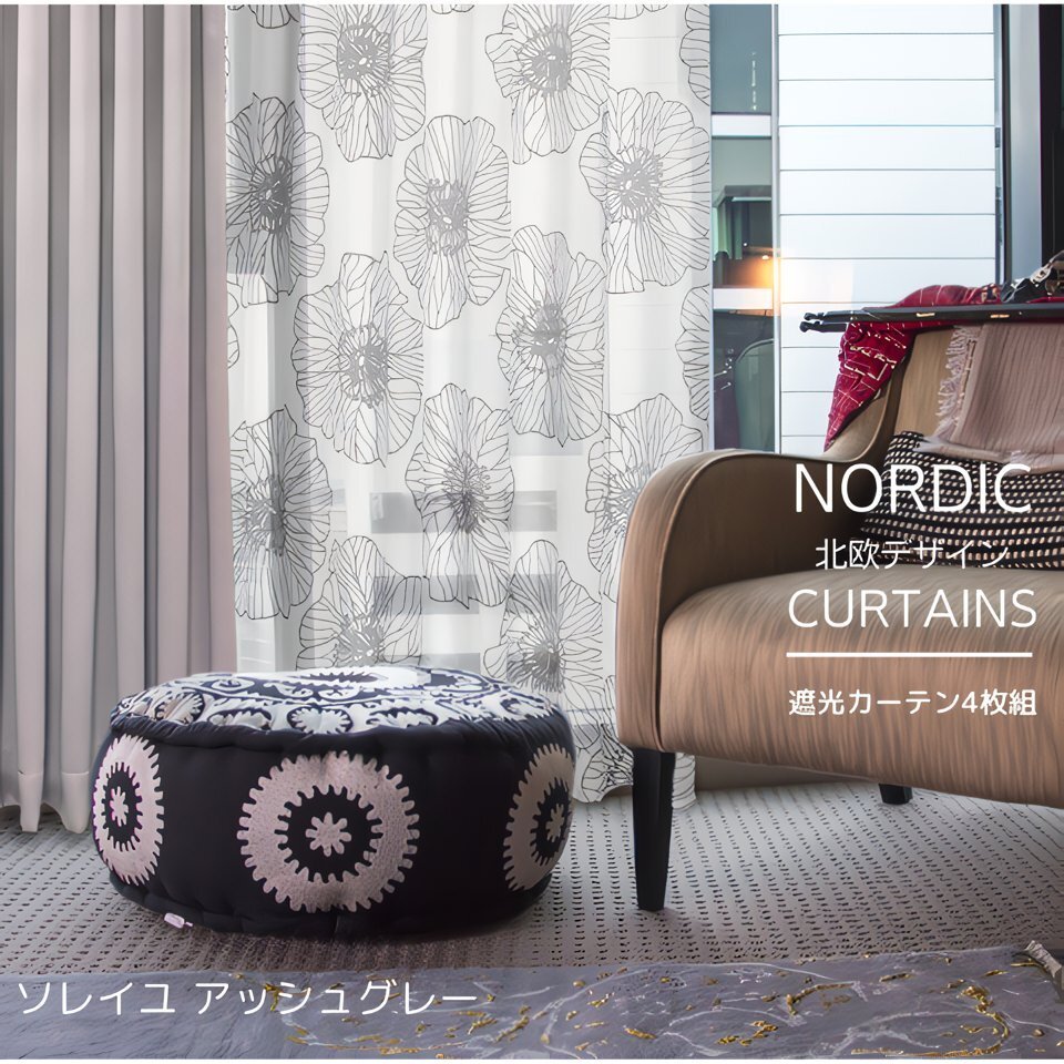 | こちらはソレイユ/アッシュグレー 丈135cmのページです。 3級遮光厚地2枚+北欧風レース2枚の 合計4枚セットカーテン | ||||