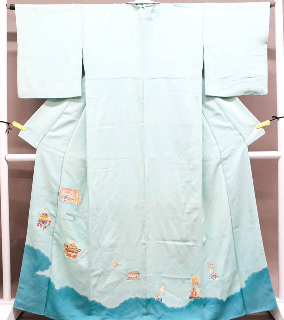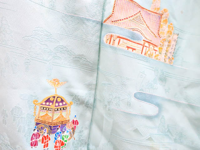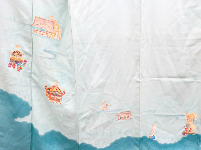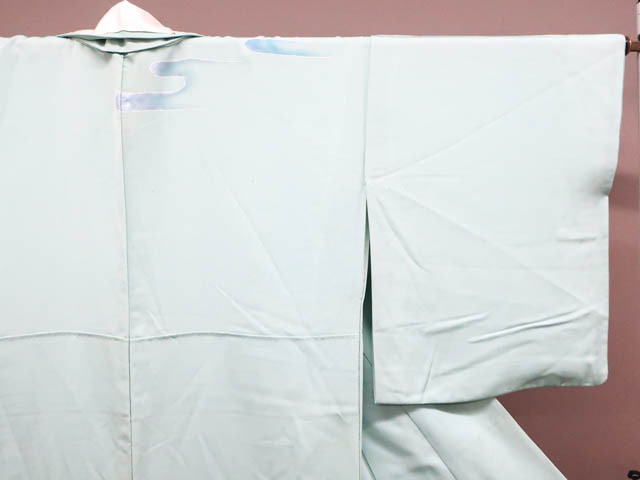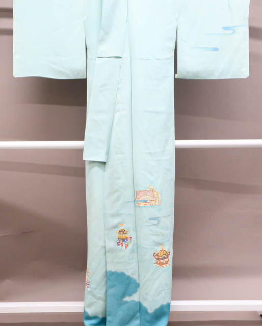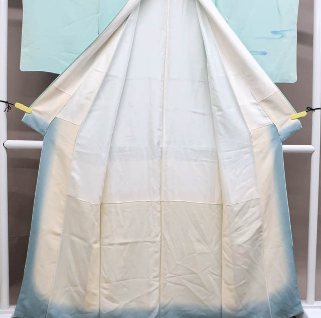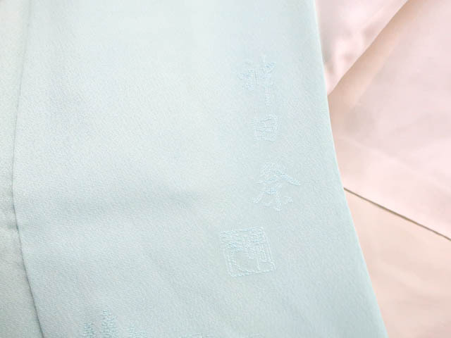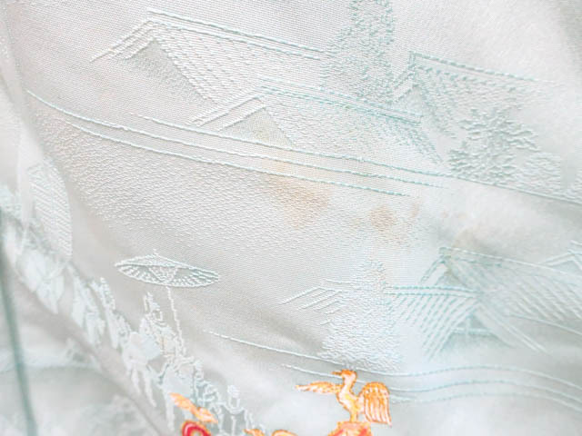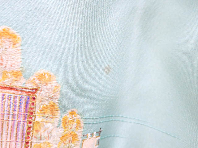 リサイクル商品のため、上前、下前、両袖など全体に汚れがございますが着用可能なお品です。 地色は 水色です。 1枚目の画像が近いお色かと思われます。 素材は正絹です。 |