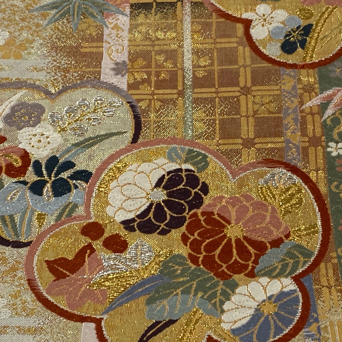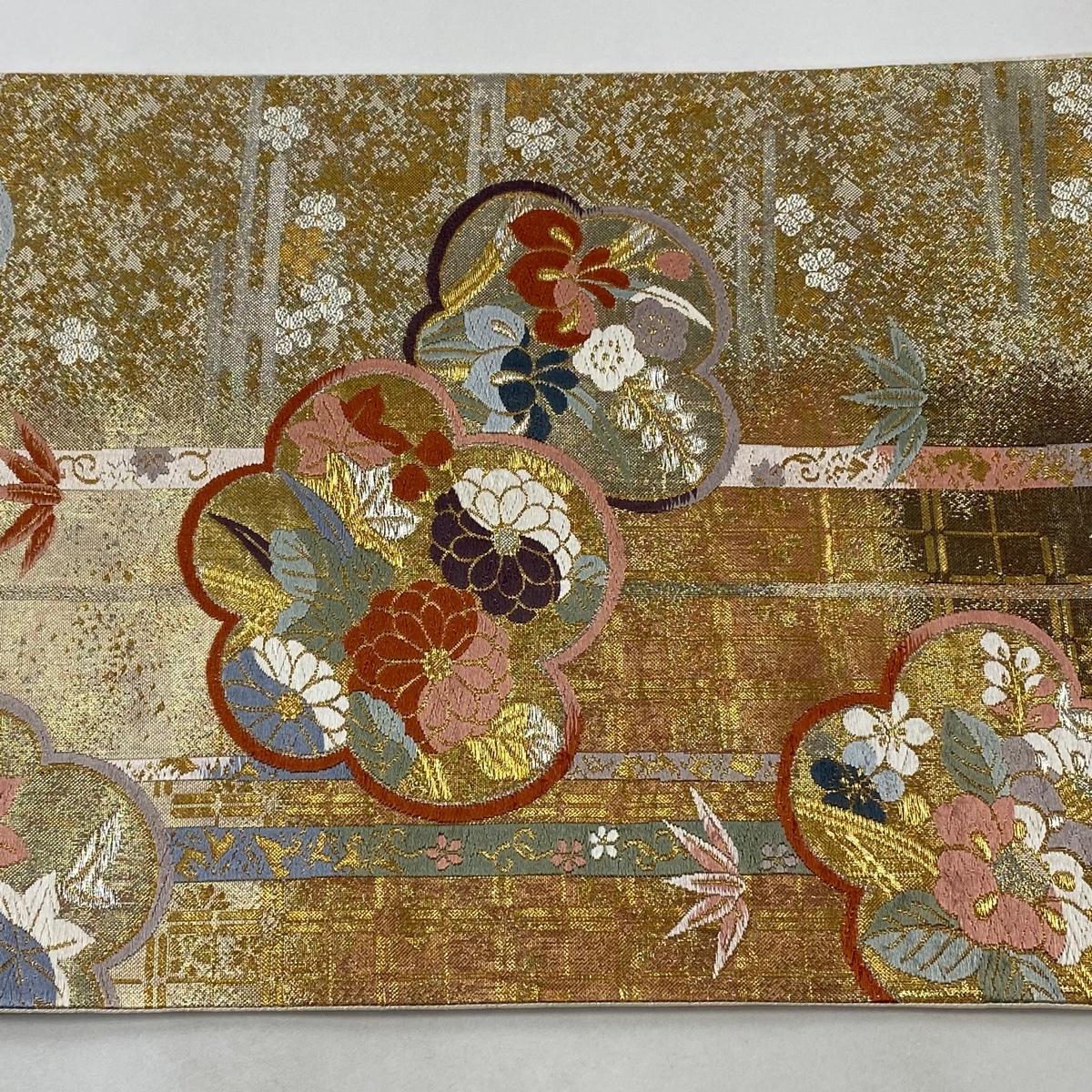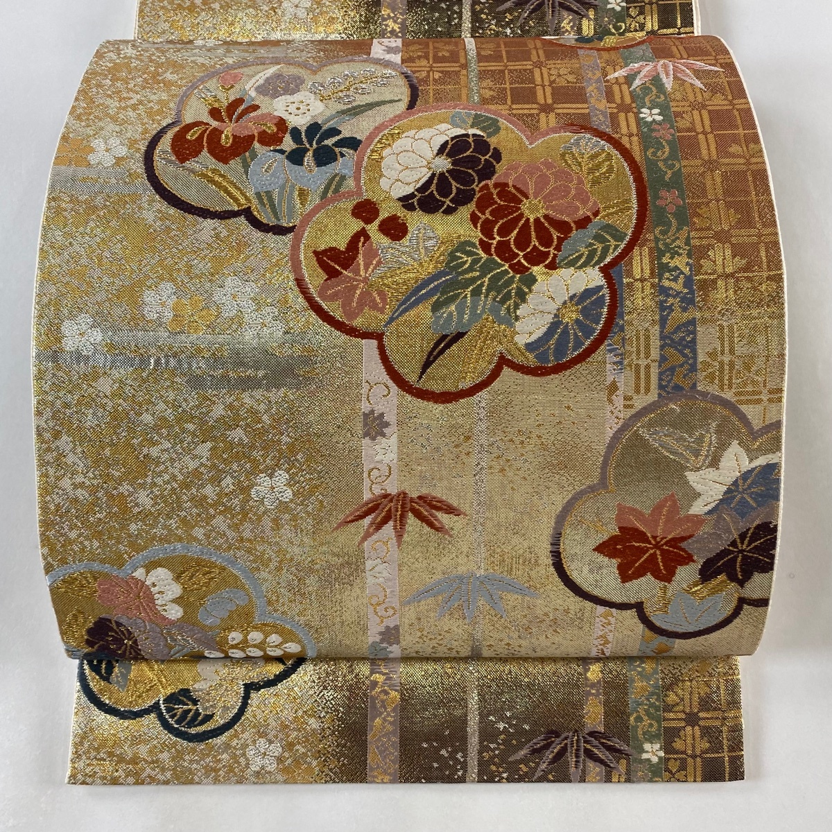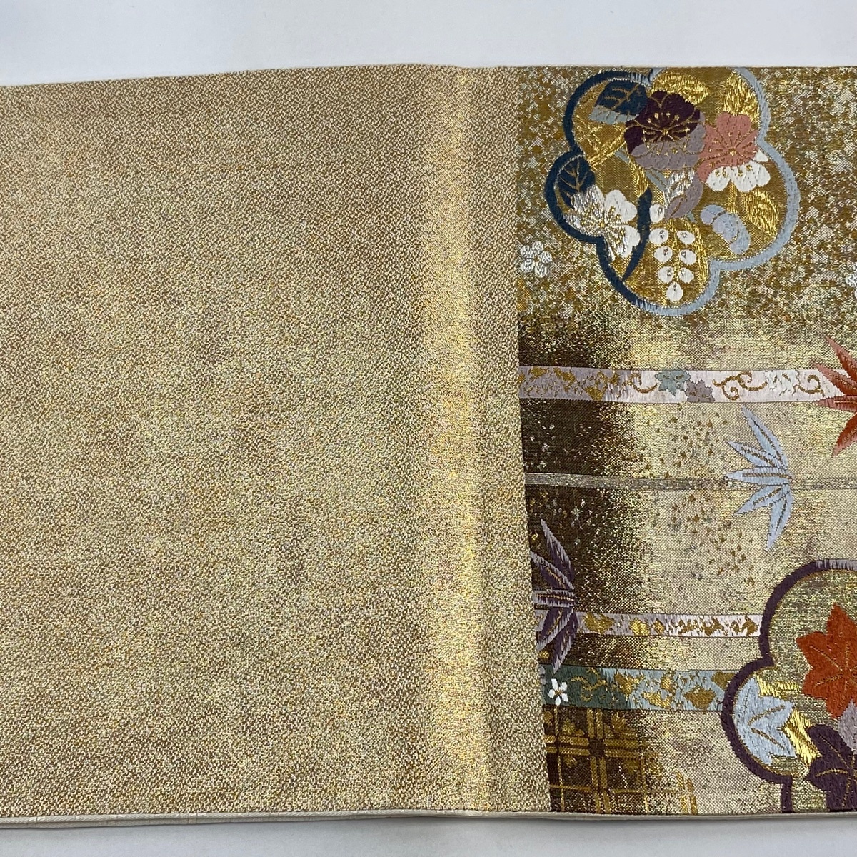 | 袋帯 美品 秀品 梅 草花 箔 金銀糸 金色 六通 正絹 【中古】 |