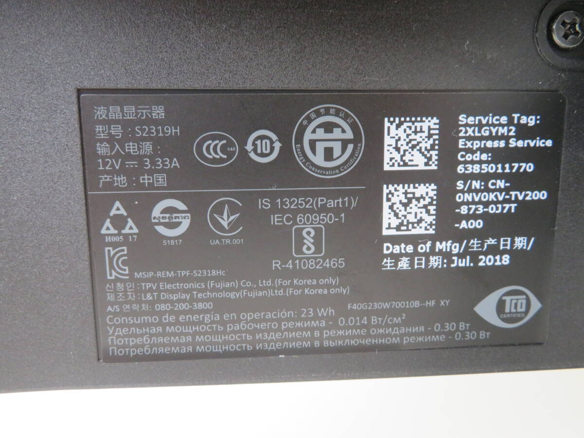 ▽液晶ディスプレイ DELL デル S2319H HDMI VGA 23インチ 2018年製 ※電源ケーブルなし