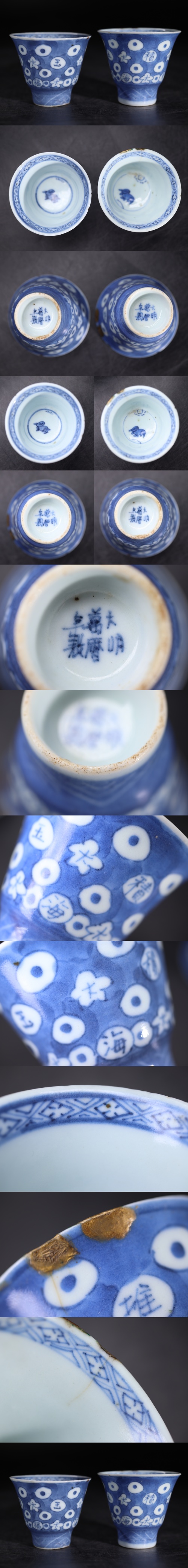 | 大明萬暦年製 底款 染付 煎茶碗 二客 金継ぎ / 明 萬暦 茶器 煎茶道具 煎茶飾 .G2387 |
