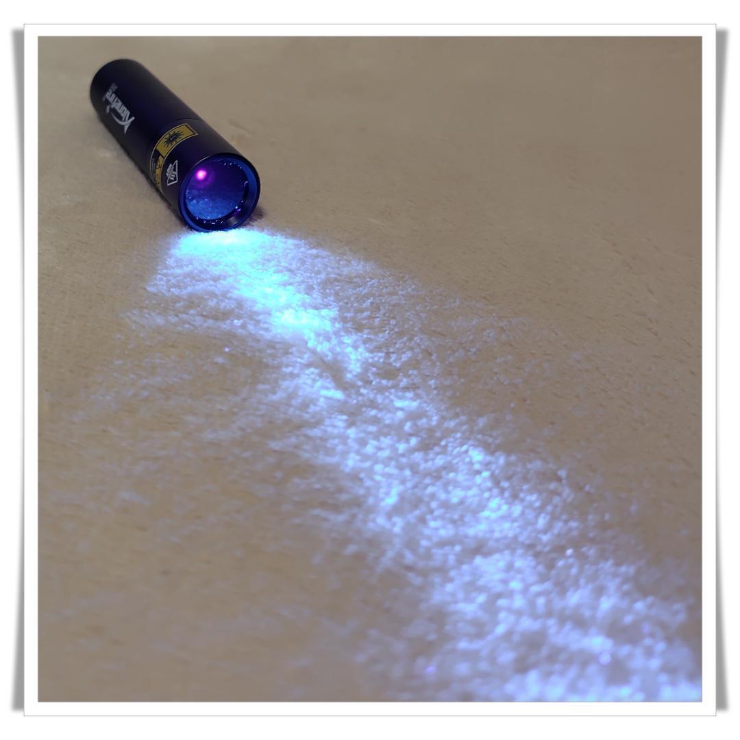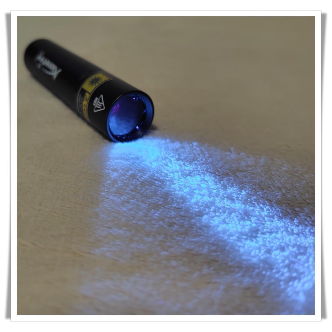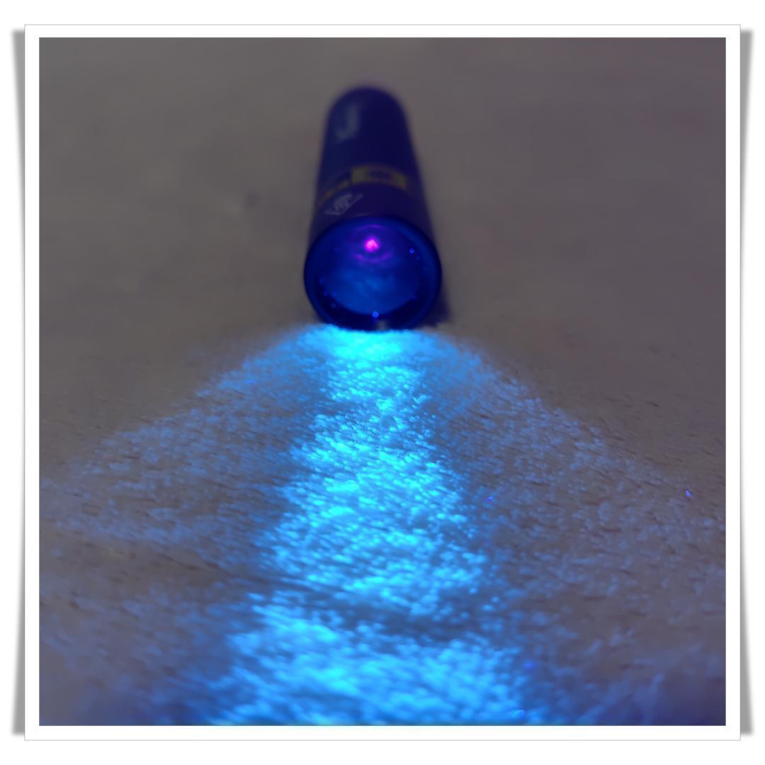 こちらのブラックライトは365nmの波長で紫外線A波(UVA)に属し、肉眼では見えない範囲の光を発し特定の物質に反応して蛍光を発する性質があります。