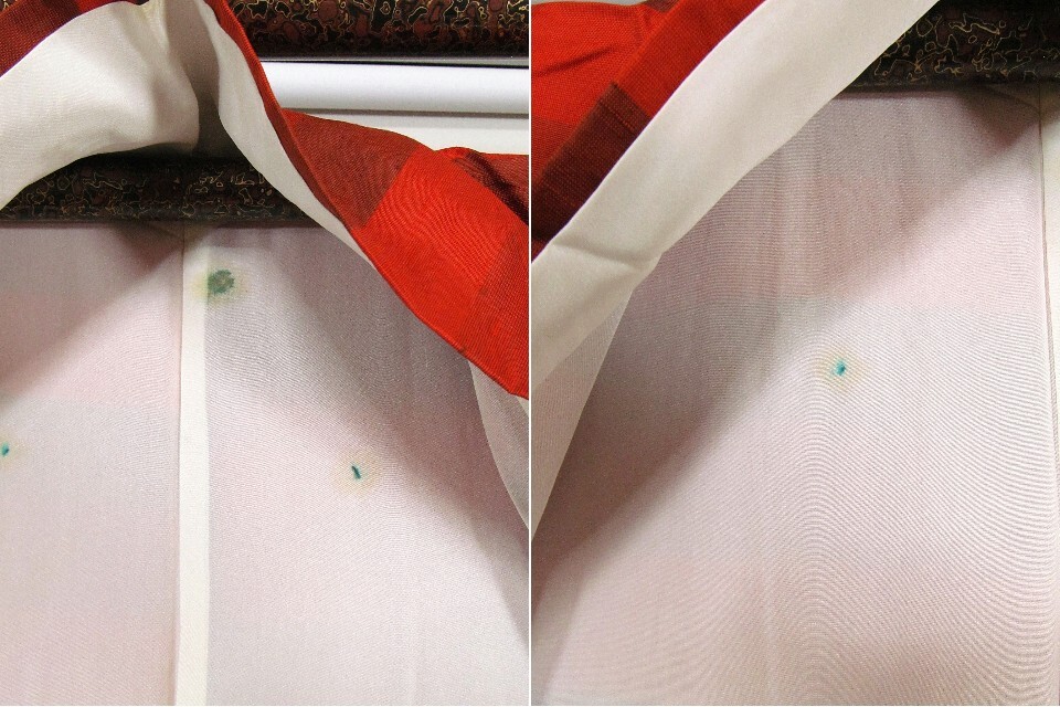 羽織は表地は綺麗です。着物もしつけ付きです。着物は裏地ホック汚れが写真のような感じであります。着物ホック汚れが表にも出ています。