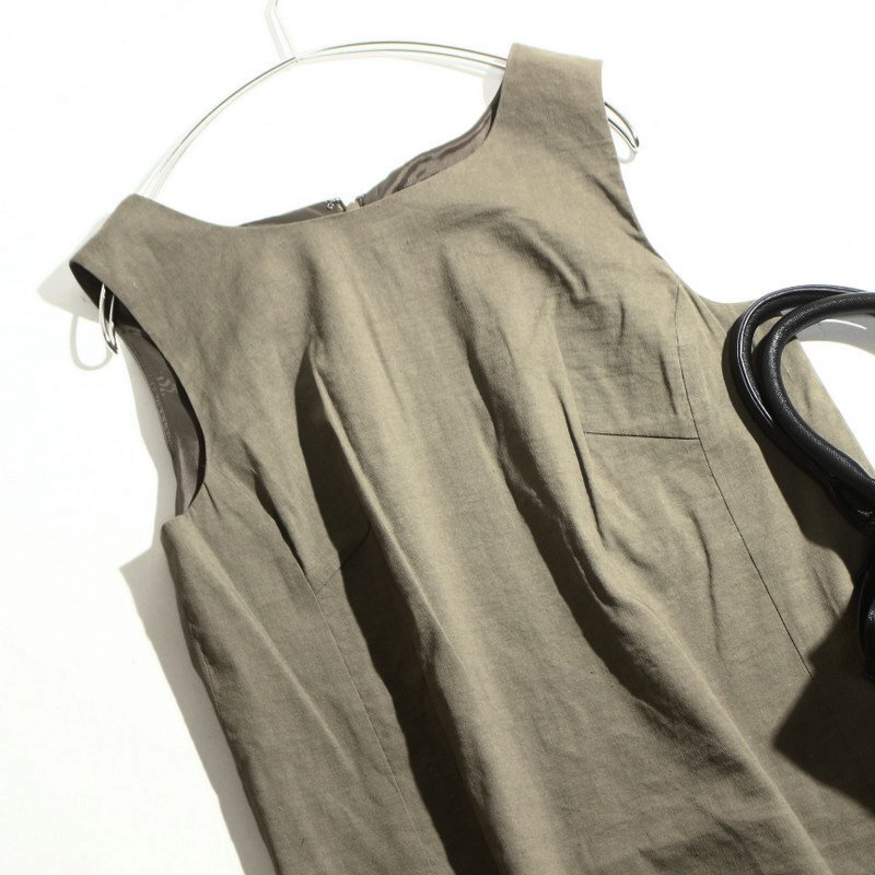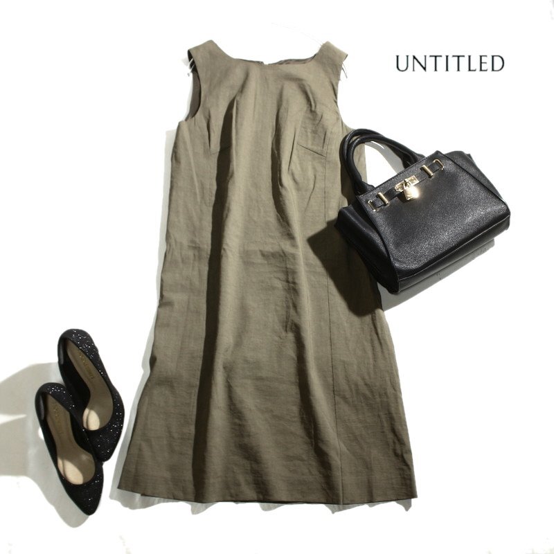 美品 アンタイトル UNTITLED 株) ワールド 夏 ストレッチ 楽ちん 綺麗め リネン ノースリーブワンピース 9号 2 カーキグリーン 緑 ミセス