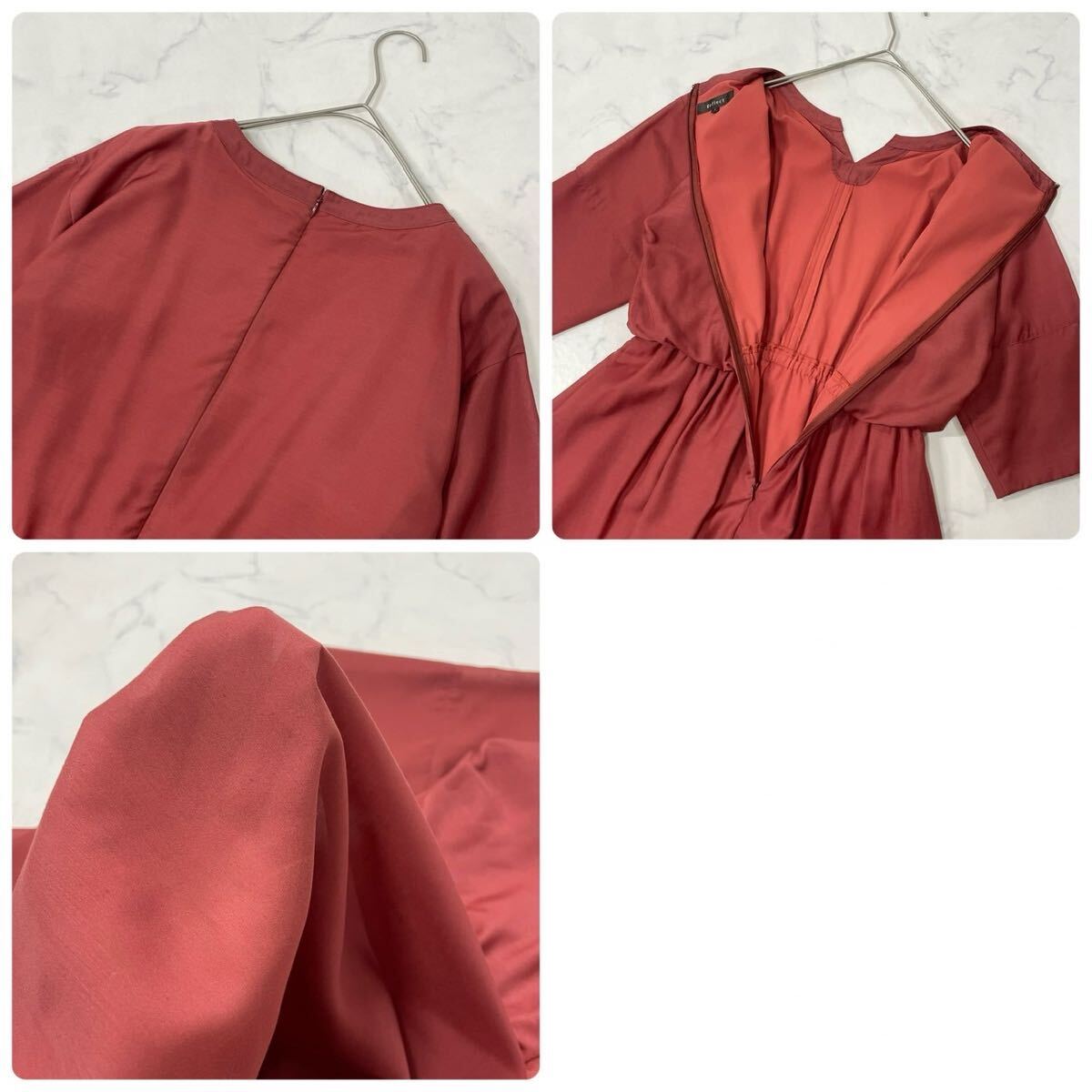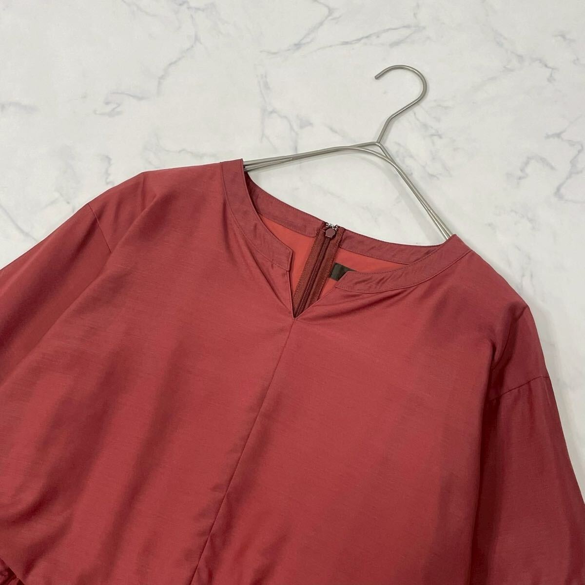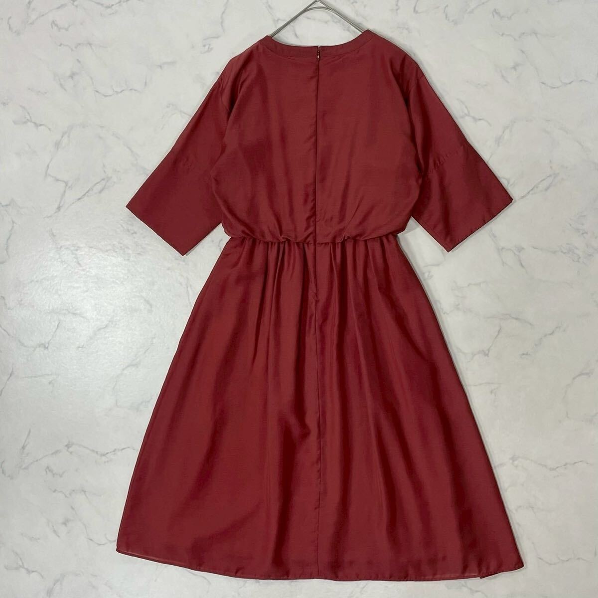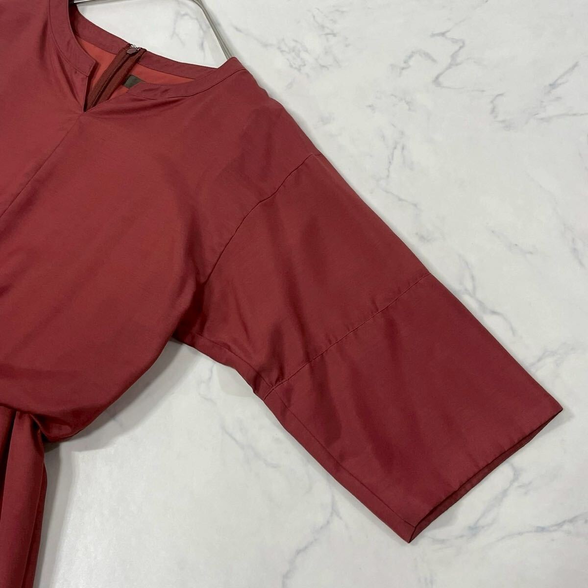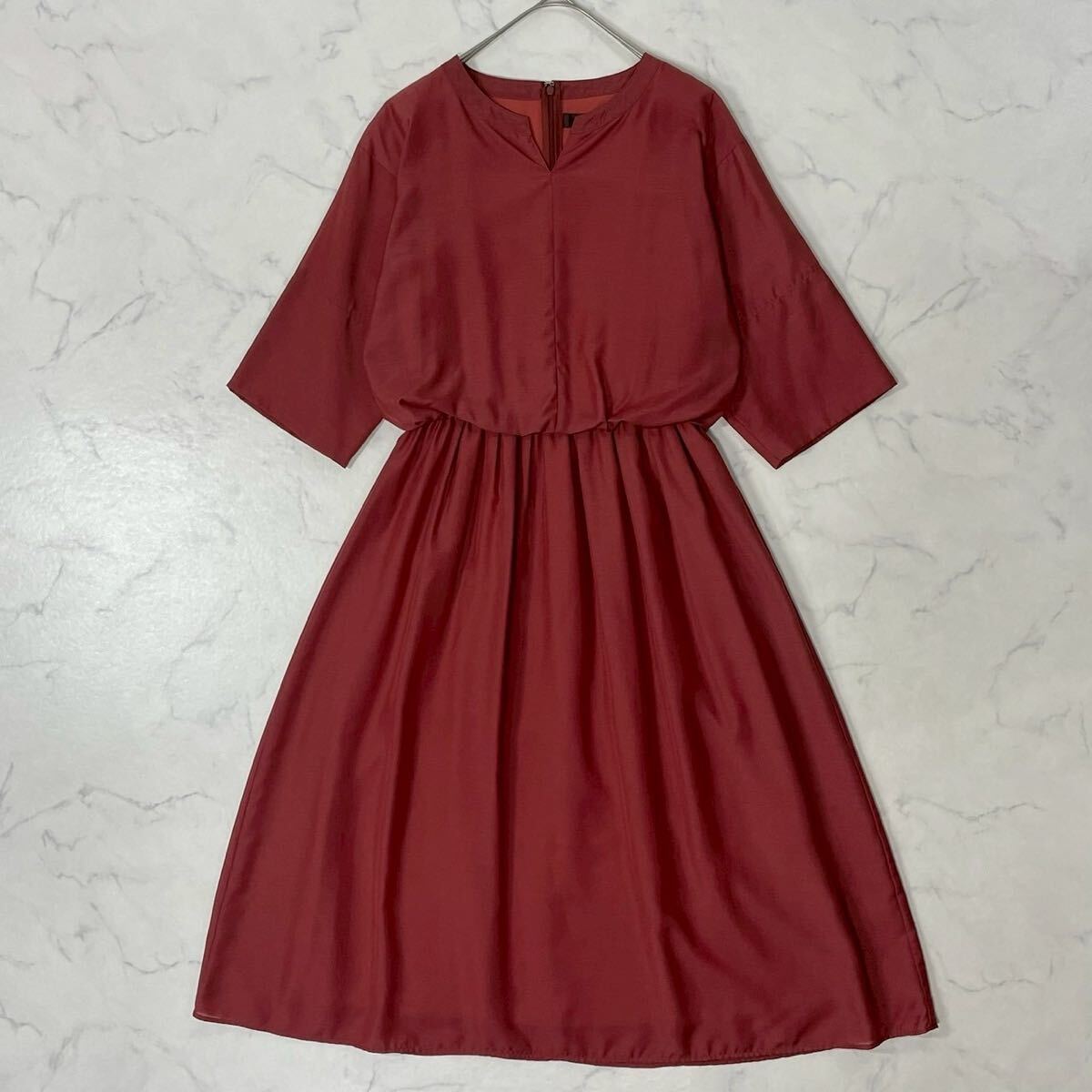 切替 ワントーン 裏地付き ウエストゴム ギャザー キーネック ジップ 七分袖 フレア ひざ丈 ワンピース