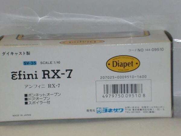 1/40 Diapet アンフィニ RX-7 黄です。箱が少し傷んでいますので、ご了承の上入札ください。商品の状況は写真でご判断の上、ノークレーム・ノーリターンでお願いします。保証はできませんが、定形外郵便での発送も可能です。