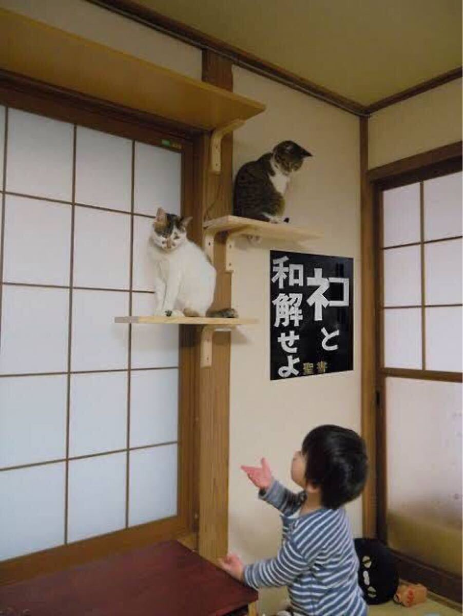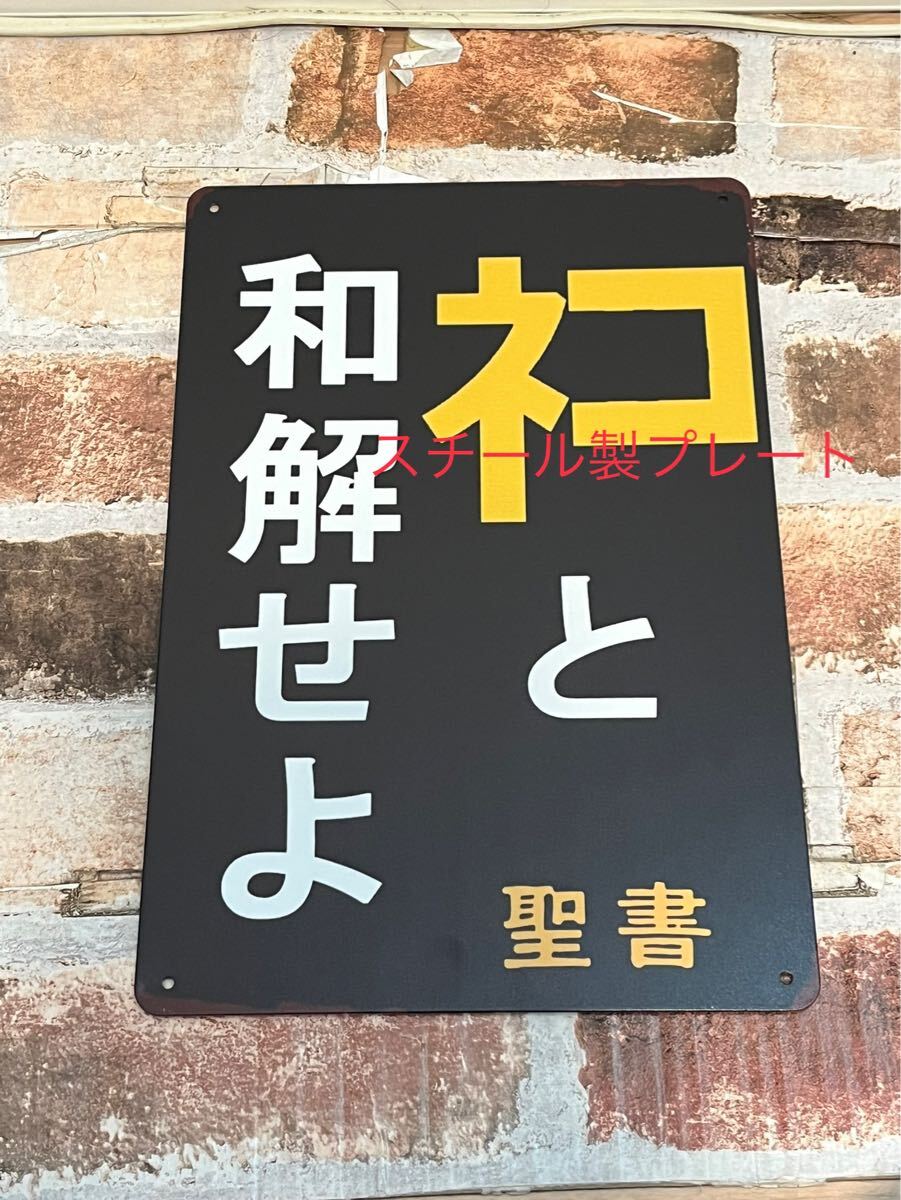 「ネコと和解せよ」は、「神と和解せよ」と書かれた看板の一部が塗りつぶされたもの。