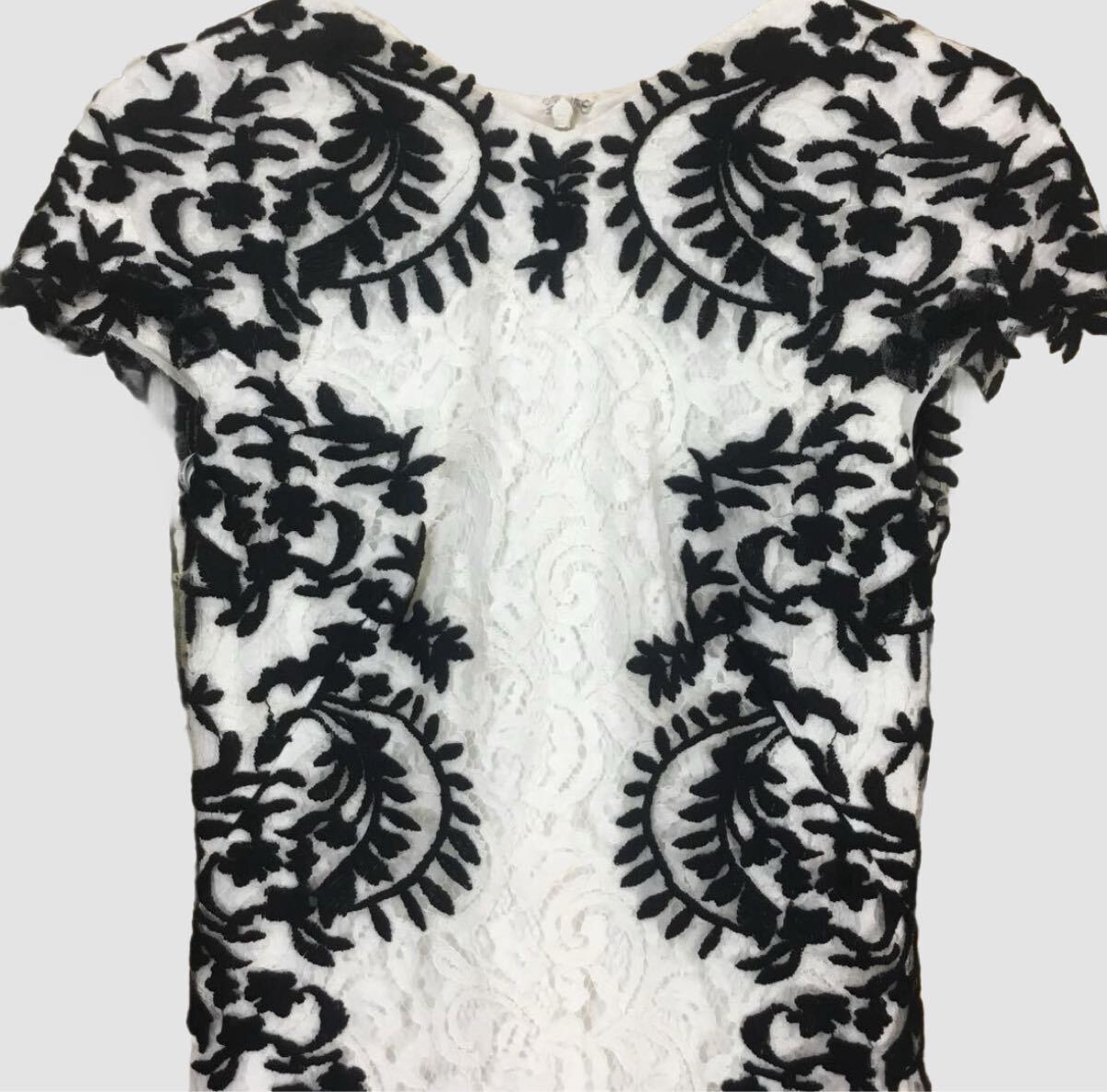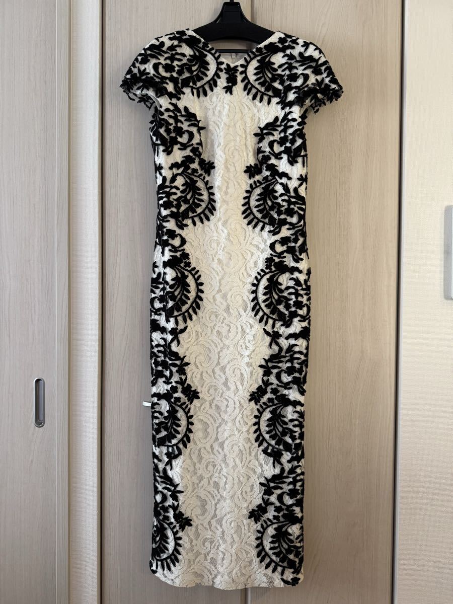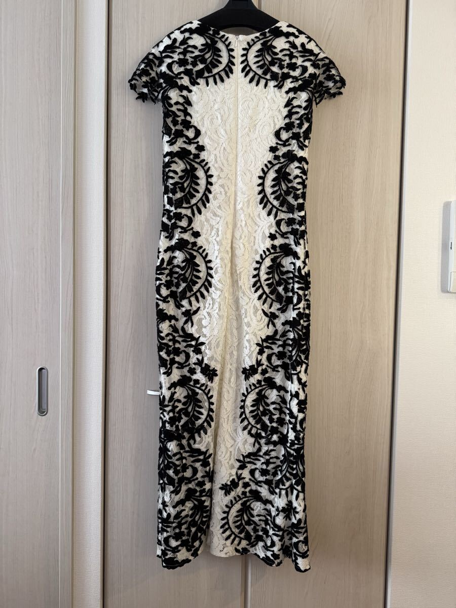 エレガントなブラック&ホワイトサイドにフラワーレースのタイトスカートワンピース、バックにホック留めのジッパー