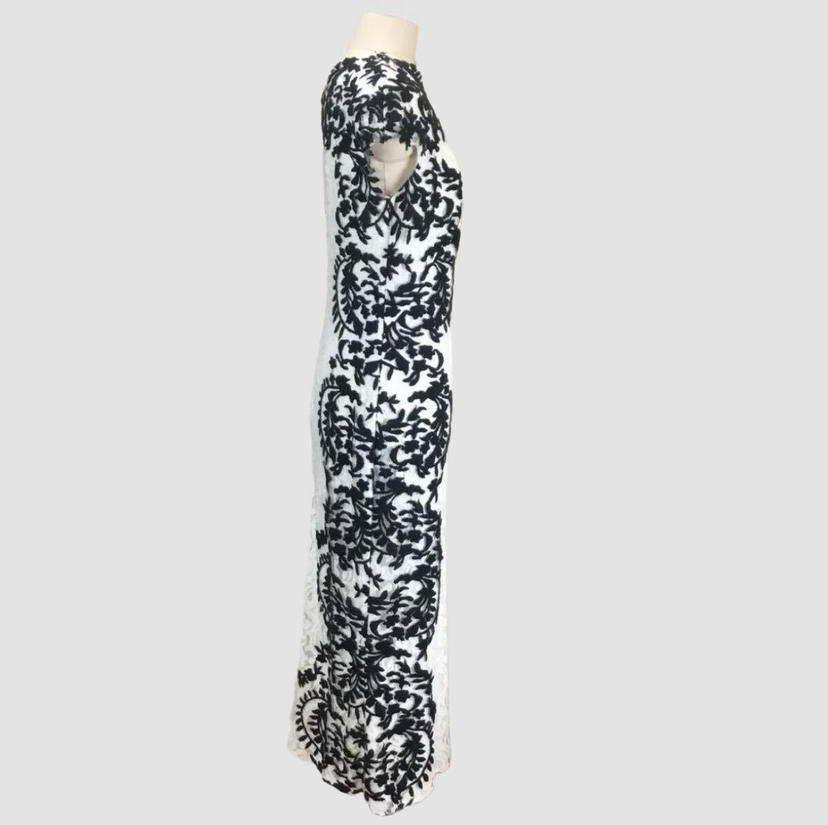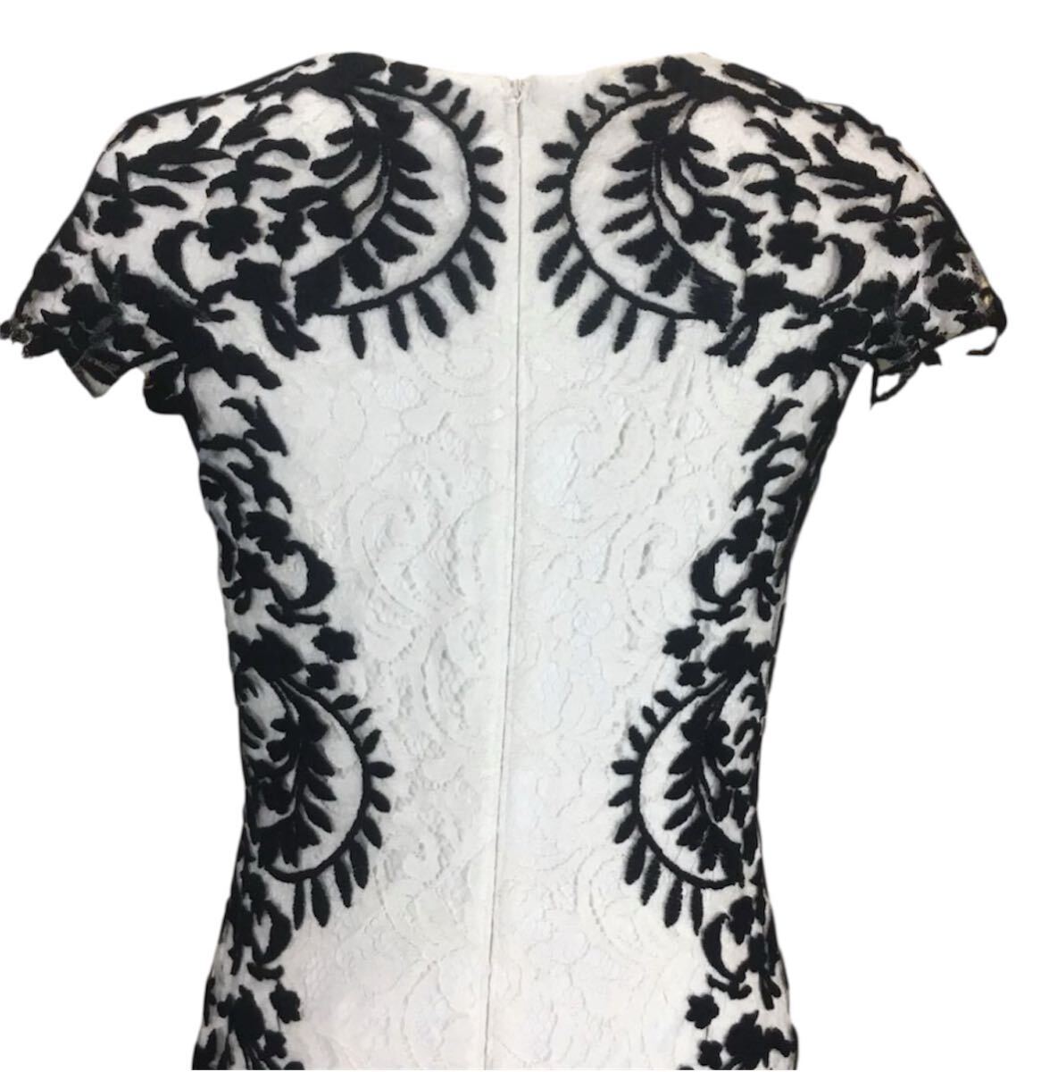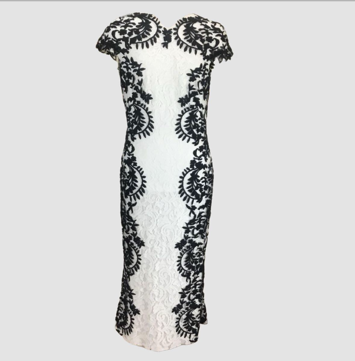 エレガントなブラック&ホワイトサイドにフラワーレースのタイトスカートワンピース、バックにホック留めのジッパー