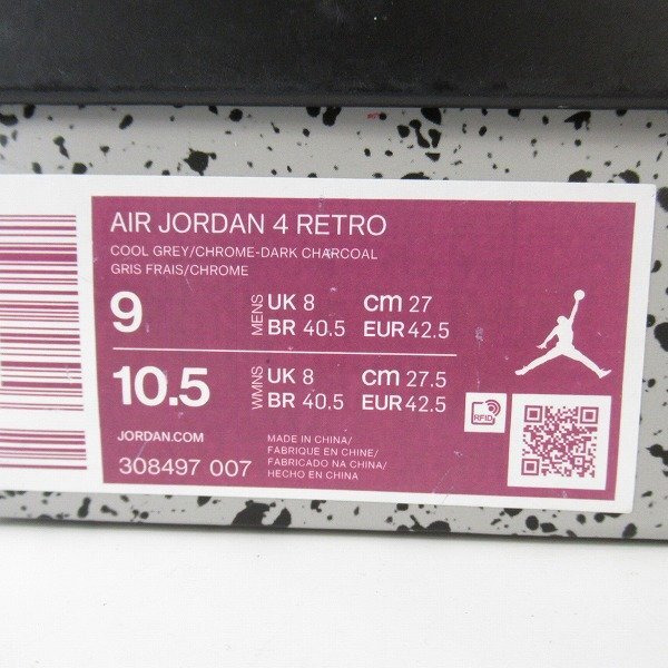 | NIKE/ナイキ AIR JORDAN 4 RETRO COOL GREY エア ジョーダン 4 レトロ クール グレー 308497-007/27 /080 | |||||||||||||||||||||||||