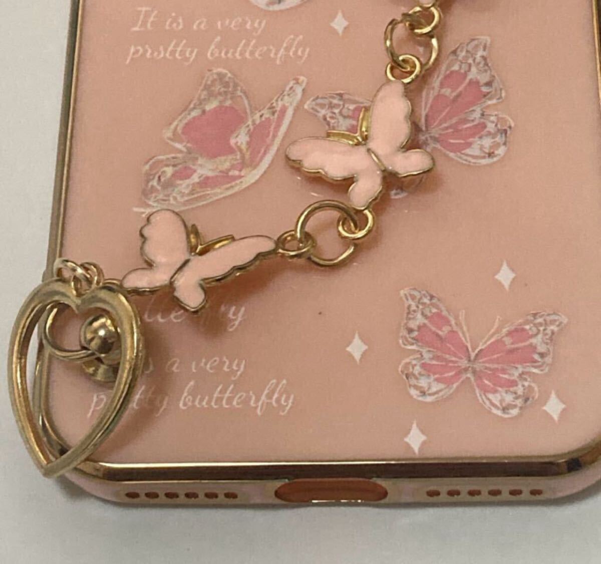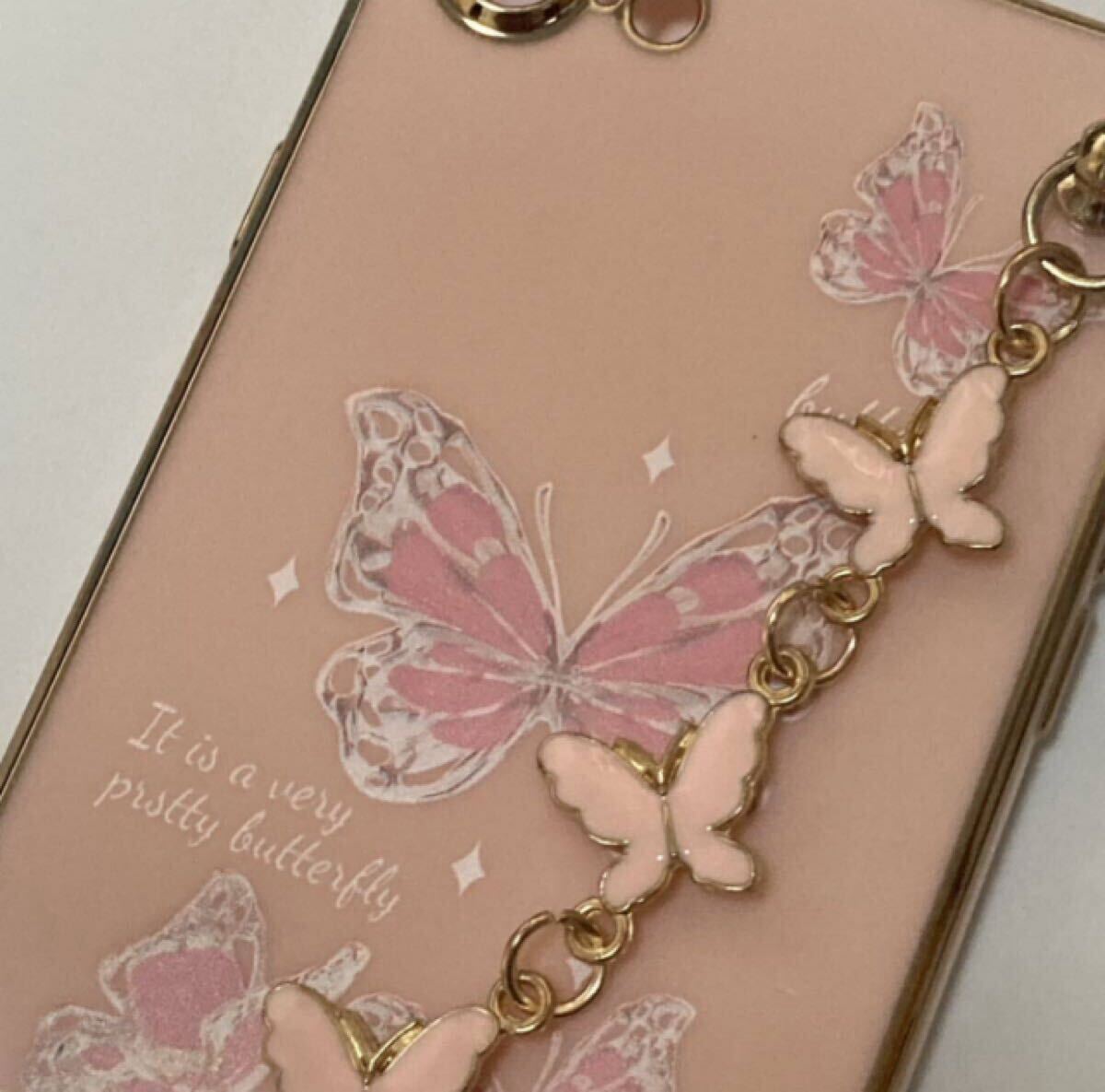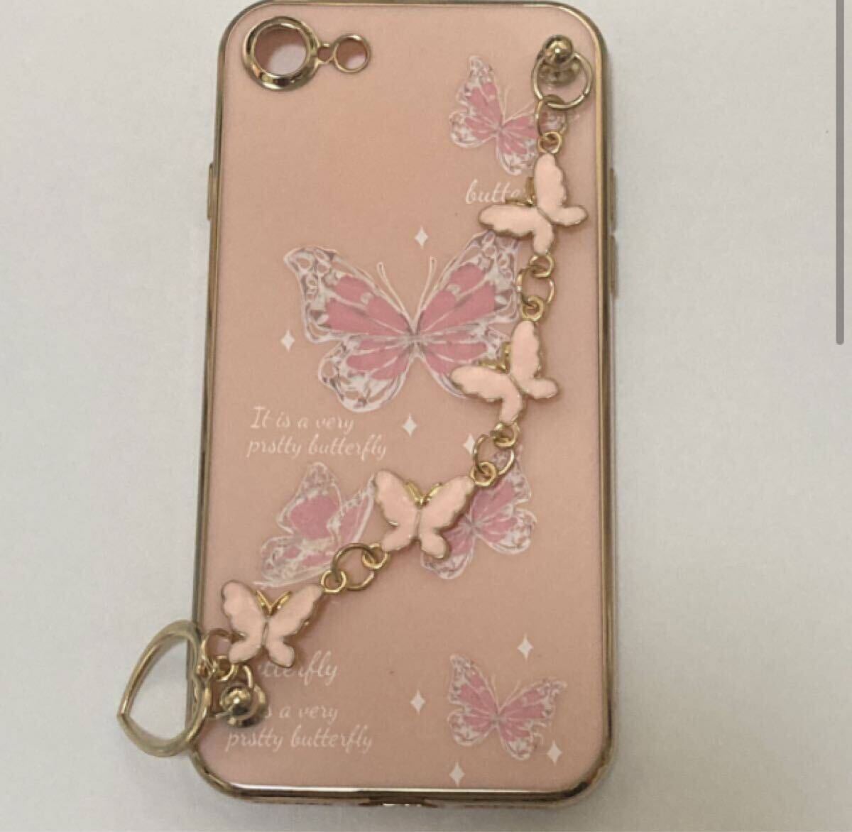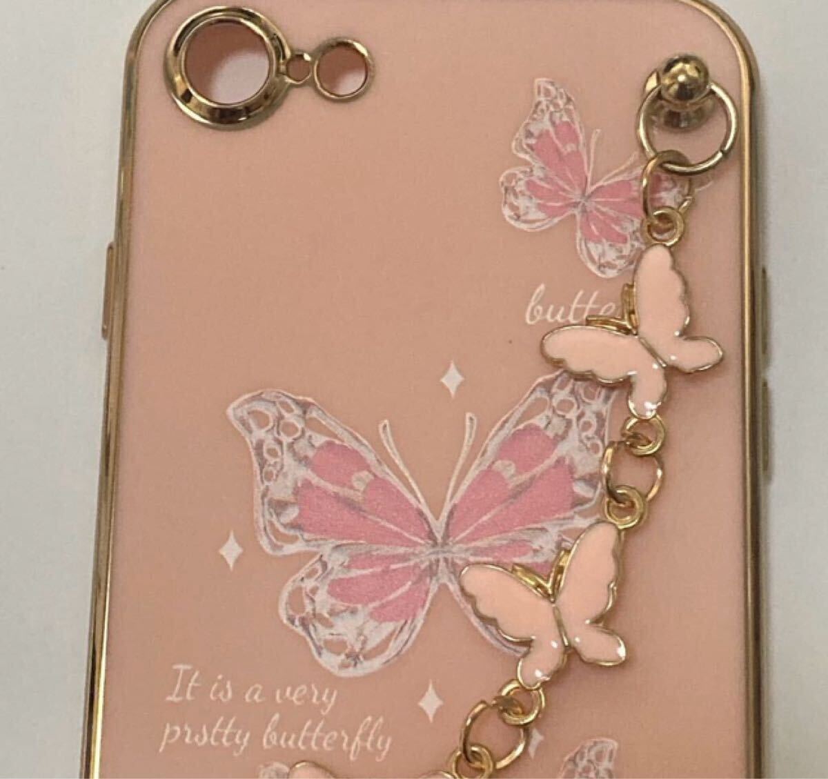新品送料無料 iphoneケース7/8/SE2.3用きれいな蝶々のアクセサリー風ケース おしゃれ ハートと蝶 取っ手付き ストラップ ピンク ゴールド