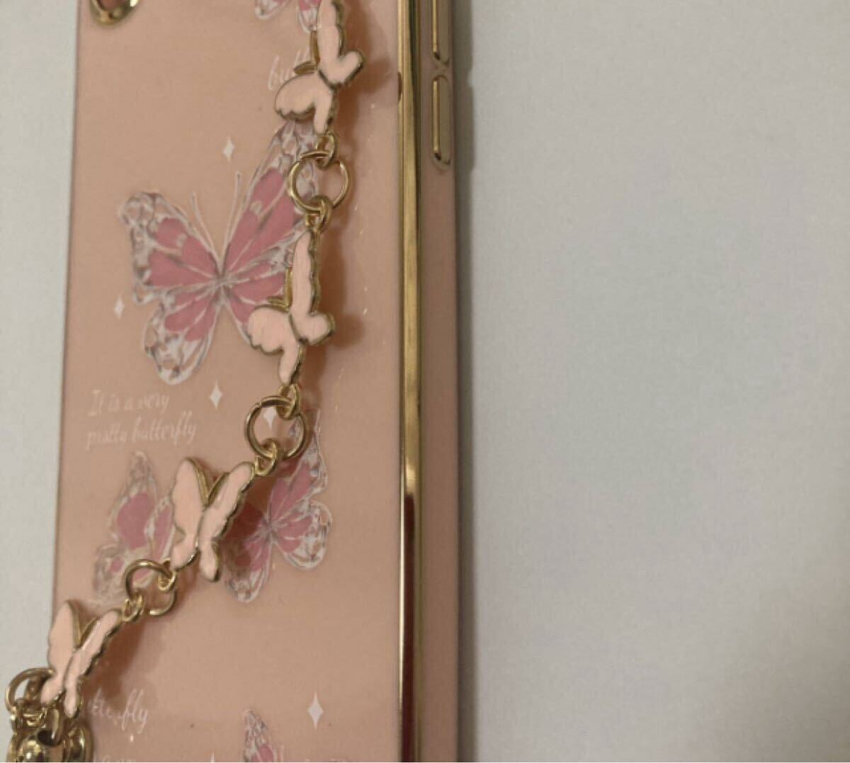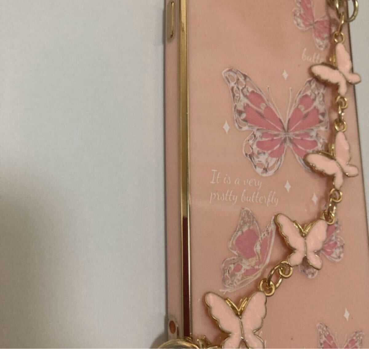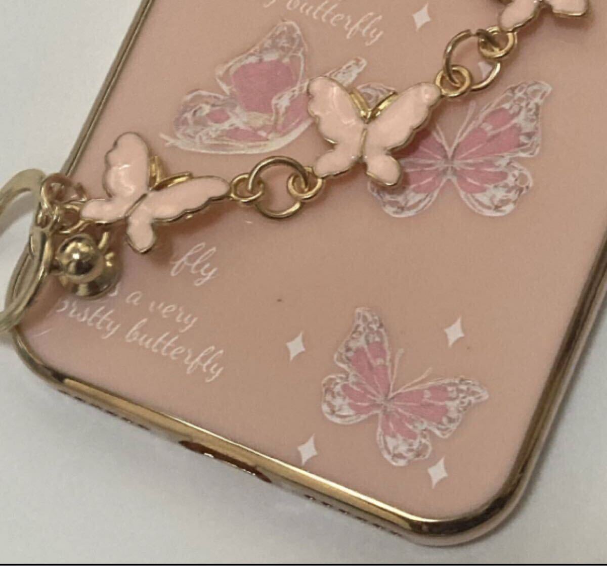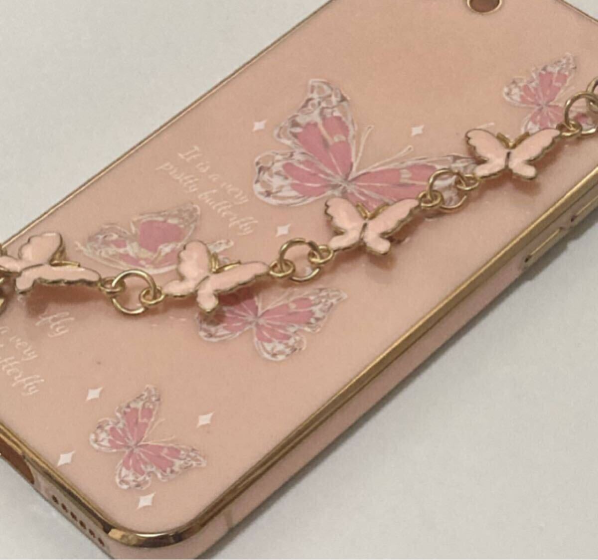 新品送料無料 iphoneケース7/8/SE2.3用きれいな蝶々のアクセサリー風ケース おしゃれ ハートと蝶 取っ手付き ストラップ ピンク ゴールド