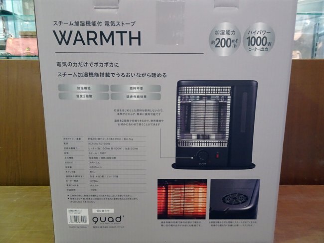 | ■■商品詳細■■ メーカー : QUADS/クワッズ 品名 : スチーム加湿機能付電気ストーブ 型番 : QS-213 サイズ :(約)幅38×奥行21.5×高さ39cm 適合床面積加湿:木造3畳、プレハブ6畳 ※掲載写真は蛍光灯等の光の反射により、多少色の違いがある場合が御座います。 【商品説明】 こちらの商品は”未使用品”で御座います。 ◆商品状態 ・・・保管に伴う僅かな小傷やスレがある場合が御座います。 商品の確認の為、箱を開封しております。 特に特記するような破損やダメージは御座いません。 記載事項をご確認、ご納得の上ご入札の程お願い致します。 ☆店頭でのお引取り大歓迎☆ 別途:この他にも“色々”出品しています 【ここクリック】でご覧下さいませ。 | ||