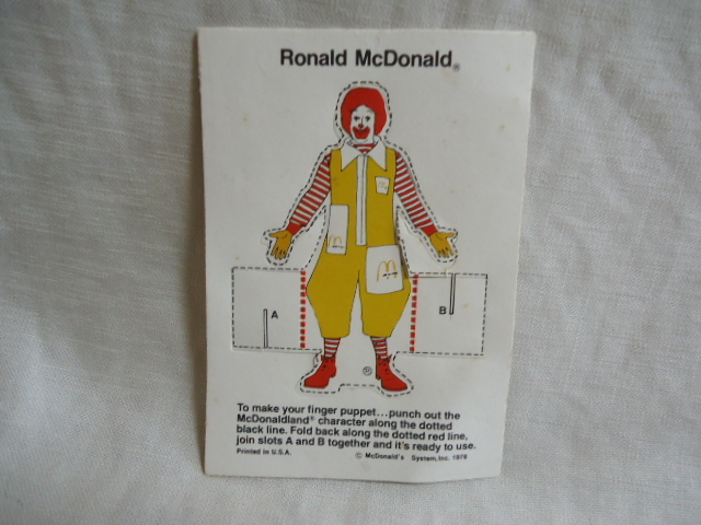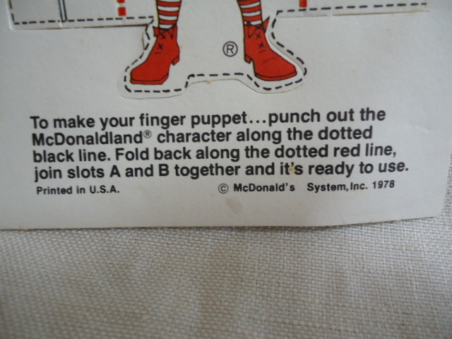 米国にて、購入しました。1978年製。米国マクドナルド社製。デッドストック物。厚紙製。サイズは、縦約12.7センチ・横約8.9センチ・ドナルドの縦約8.5センチ・横約5.5センチです。ヴィンテージ物ですが、美品です。ヴィンテージ物に、ご理解のある方・24時間以内に、お手続き入力後、期限内にかんたん決済、出来る方のみ、ご入札をお願い致します。 ※※発送方法・送料は、特定記録付き定形郵便(追跡可能・補償無し)ですと、320円又は、レターパックライト郵便(追跡可能・補償無し)ですと、430円又は、簡易書留郵便(追跡可能・手渡し配達・補償有り)ですと、460円です。※※ ☆★★★★★☆送料は、変わりますが、何点でも、同梱包可能です。数点落札されましたら、まとめて取引を、選択お願いします。☆★★★★★☆