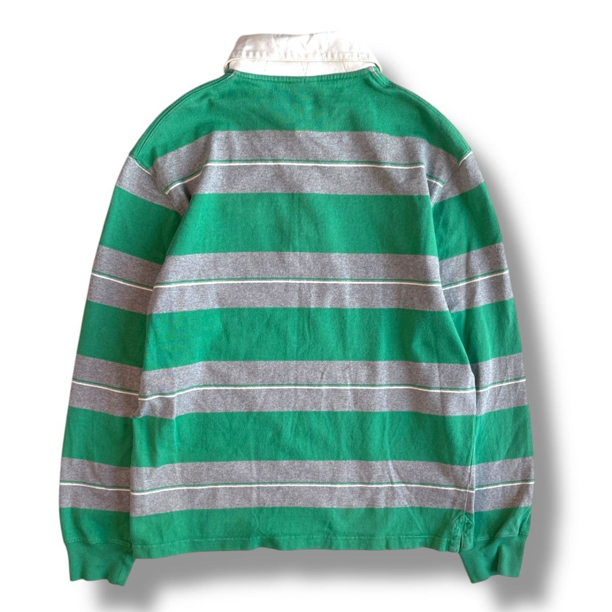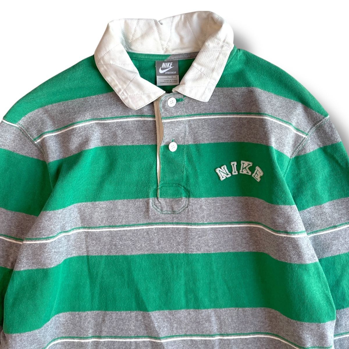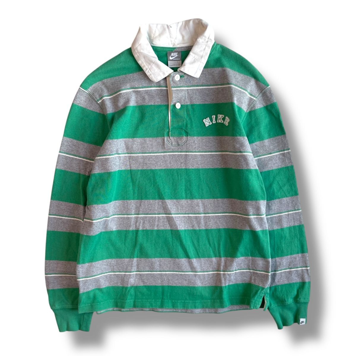 国内正規★ NIKE ナイキ 長袖 ボーダー フェルトロゴ ヘヴィーウェイト ポロシャツ Lサイズ 緑 グレー ラガーシャツ 古着 トップス
