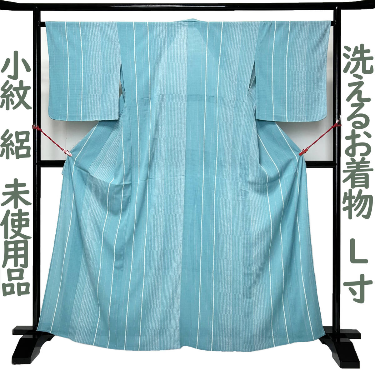 ★着物 単衣 小紋 洗える 絽 縦縞 未使用 カジュアル スカイブルー 縦縞 綺麗 中古 仕立て上がり Lサイズ 送料無料★