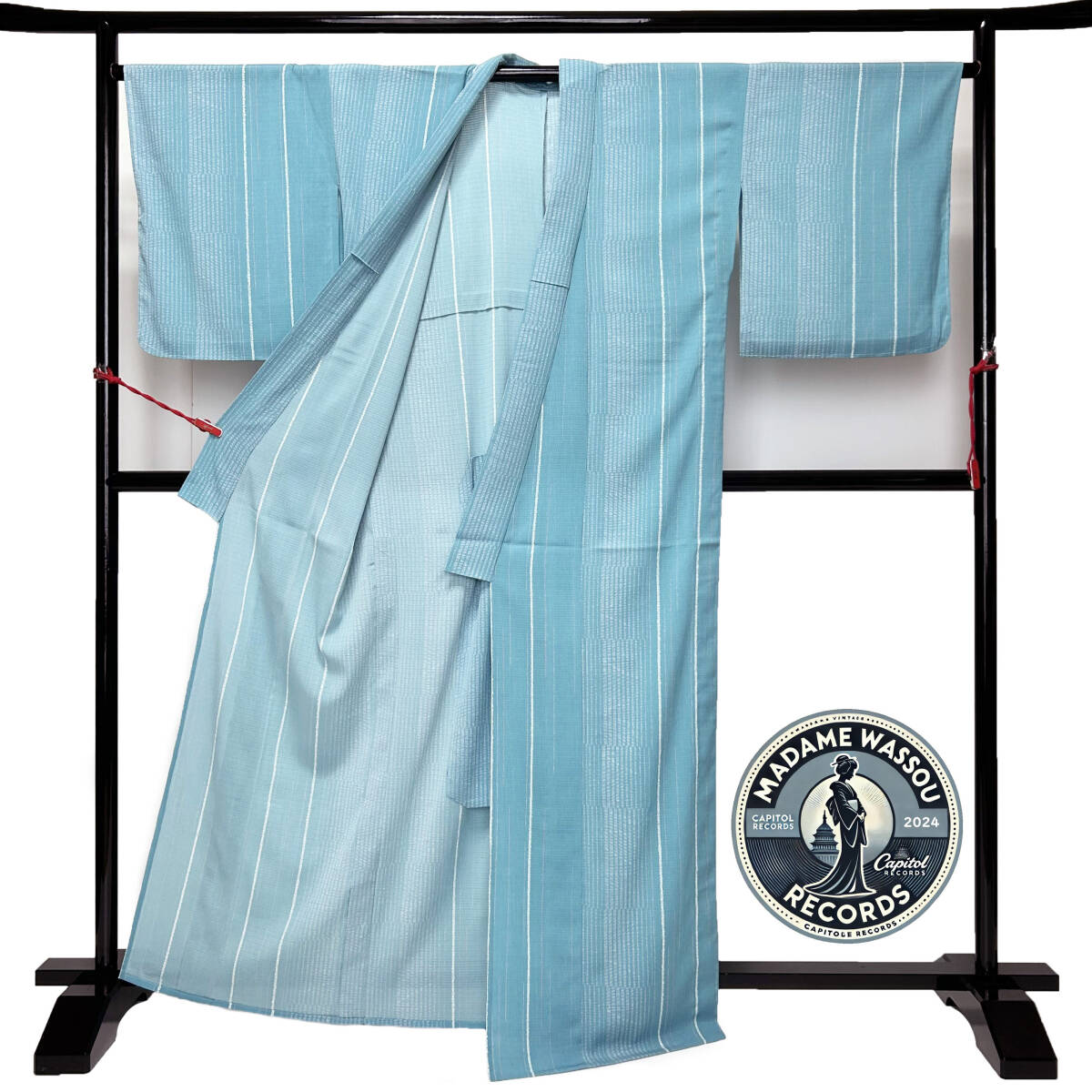 着物 単衣 小紋 洗える 絽 縦縞 未使用 カジュアル スカイブルー 縦縞 綺麗 中古 仕立て上がり Lサイズ MWR-No.236 20082025 マダム 和装