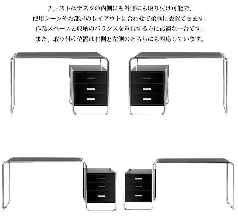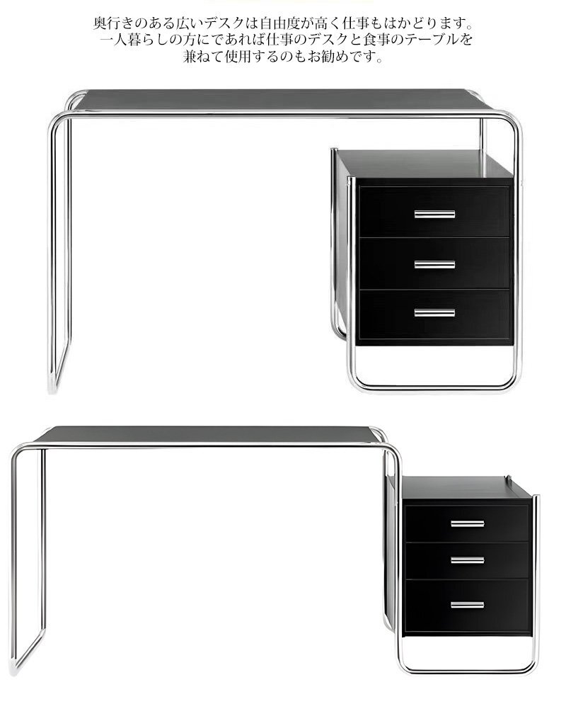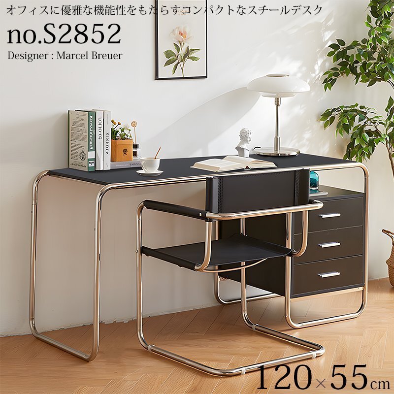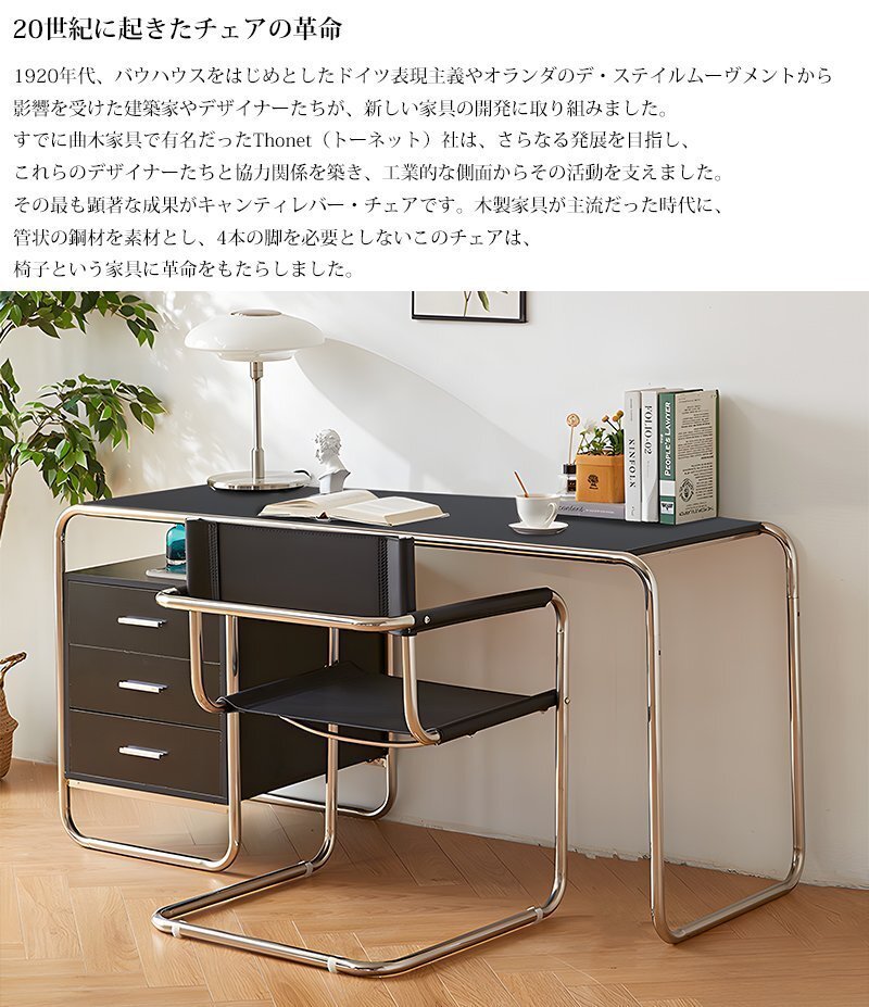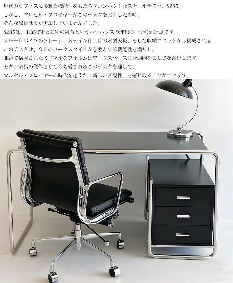 ![]() 現代のオフィスに優雅な機能性をもたらすコンパクトなスチールデスク、S285。 しかし、マルセル・ブロイヤーがこのデスクを設計した当時、 そんな風景はまだ実現していませんでした。 S285は、工業技術と芸術の融合というバウハウスの理想の一つの到達点です。 スチールパイプのフレーム、ステイン仕上げの木製天板、そして収納ユニットから構成される このデスクは、今日のワークスタイルが必要とする機能性を満たし、 曲線で構成されたミニマルなフォルムはワークスペースに普遍的な美しさを演出します。 モダン家具の傑作として今も愛されるこのデスクを通して、 マルセル・ブロイヤーの時代を超えた「新しい客観性」を感じ取ることができます。 1920年代、バウハウスをはじめとしたドイツ表現主義やオランダのデ・ステイルムーヴメントから 影響を受けた建築家やデザイナーたちが、新しい家具の開発に取り組みました。 すでに曲木家具で有名だったThonet(トーネット)社は、さらなる発展を目指し、 これらのデザイナーたちと協力関係を築き、工業的な側面からその活動を支えました。 その最も顕著な成果がキャンティレバー・チェアです。木製家具が主流だった時代に、 管状の鋼材を素材とし、4本の脚を必要としないこのチェアは、 椅子という家具に革命をもたらしました。 チェストはデスクの内側にも外側にも取り付け可能で、使用シーンやお部屋のレイアウトに合わせて柔軟に設置できます。 作業スペースと収納のバランスを重視する方に最適な一台です。 また、取り付け位置は右側と左側のどちらにも対応しています。 デザイナー:マルセル・ブロイヤー サイズ(約) 縦75cm、横133cm、奥行き60cm 天板:横120cm、奥行き55cm 天板厚み(約):15mm 素材 天板:アッシュ材 脚:ステンレス製 生産国:中国 ※新品未使用品になります。 ※椅子は付属いたしません。 ※この商品はお客様にて組み立てが必要になります。 ※簡易説明書が付属しております。 ※こちらの商品はリプロダクト品です。Thonet トーネット 社の商品ではございません。 |