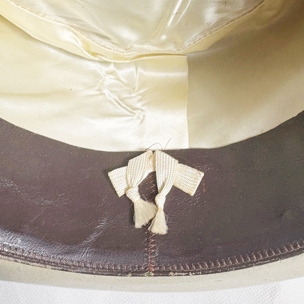 状態は全体的に薄汚れや若干の薄汚れあり、クラウンやブリム裏に細かい虫食い跡が点在しており、レザースベリにも若干の使用感、ライナーにうっすら汚れはありますが、まだまだ着用可能なグッドコンディションです。
