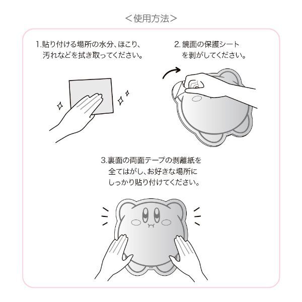 | 商品説明 | 星のカービィの壁に貼るインテリアミラーです。玄関やトイレなどお好きな場所に貼り付けられます!【使用方法】1.貼り付ける場所の水分、ほこり、汚れなどを拭き取ってください。2.鏡面の保護シートを剥してください。3.裏面の両面テープの剥離紙を全てはがし、お好きな場所にしっかり貼ってください。 |