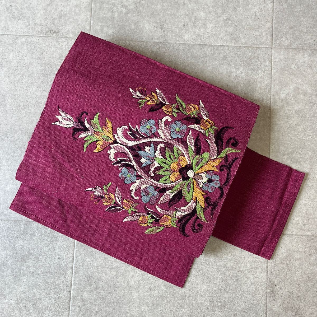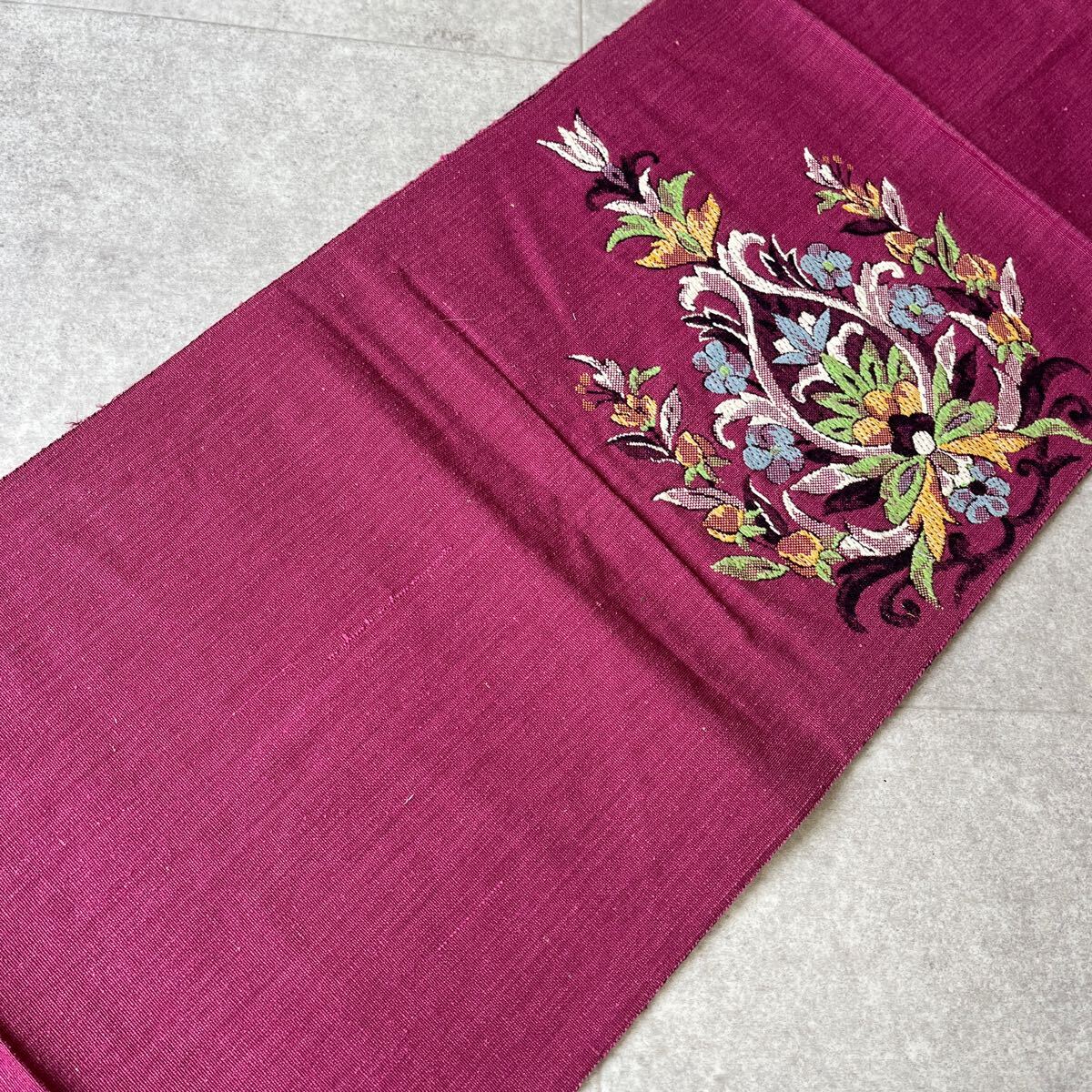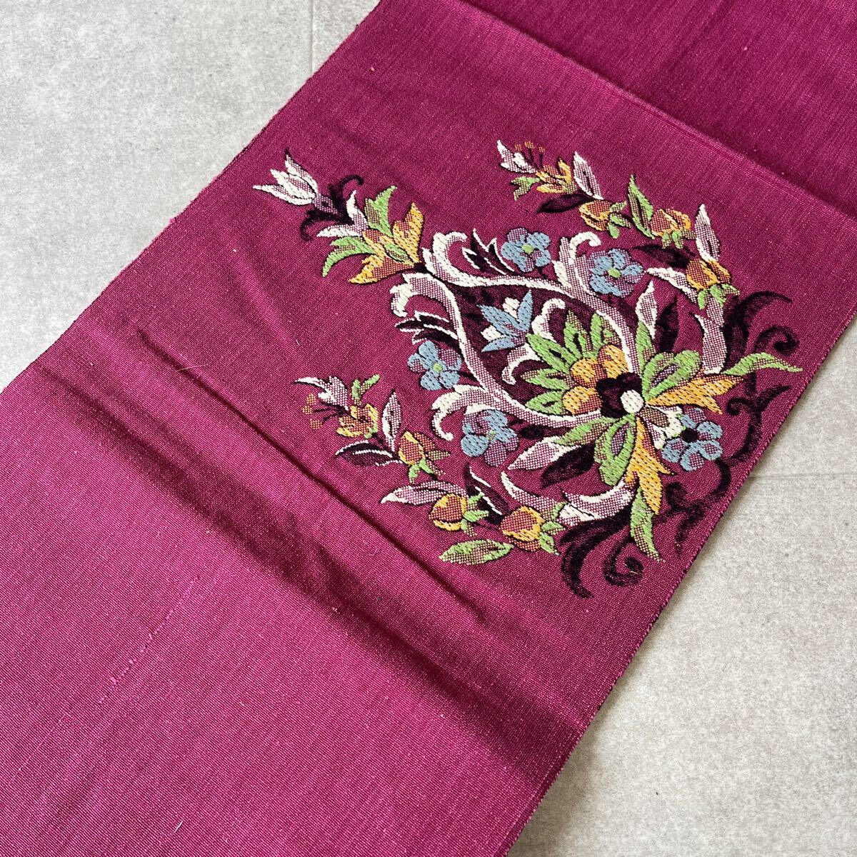 アンティーク 名古屋帯 紬 花 赤紫 着物 昭和レトロ 大正ロマン モダン 和洋折衷コーデ リメイク き01-01t