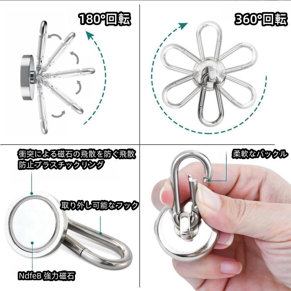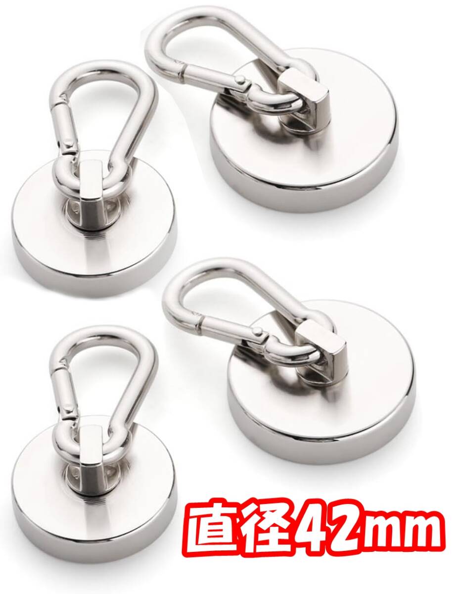 【4個-直径42mm】カラビナ付き磁石 超強力磁石 マグネットフック ネオジム磁石 ステンレス製 防錆