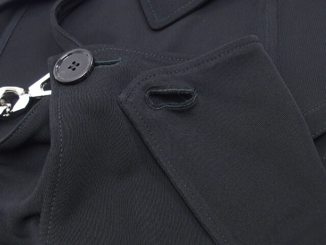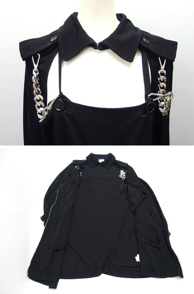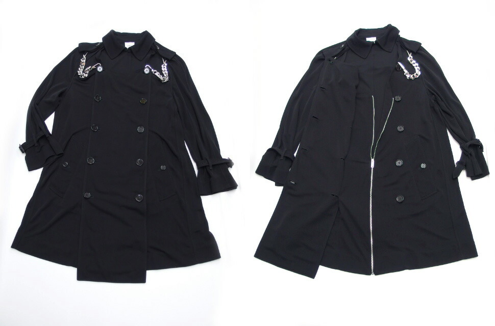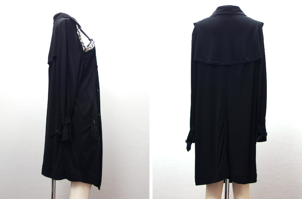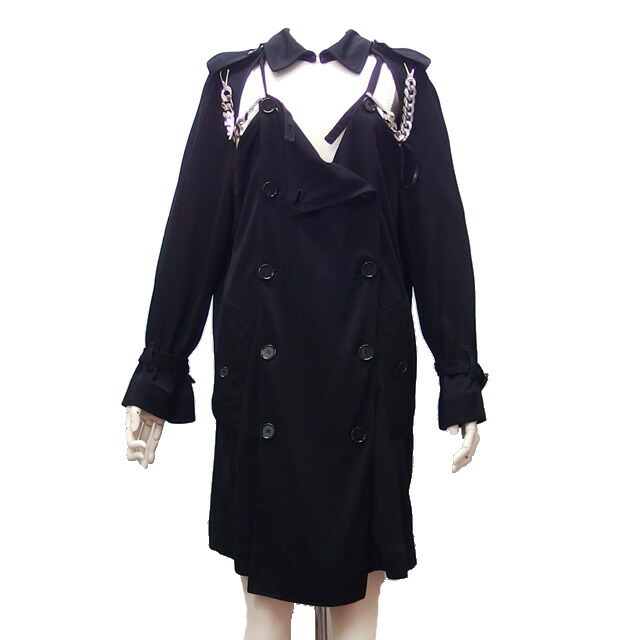 商品名 | デコンストラクテッド・クレープ・トレンチドレス ワンピースドレス チェーン付き ブラック(黒) 襟付き 前開き ボタン開閉 ファスナー開閉 シルバー金具 長袖 膝丈 サイズ38(イタリア) M~Lサイズ レディース 4562512 |