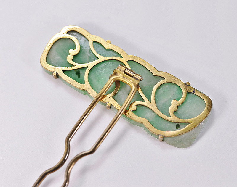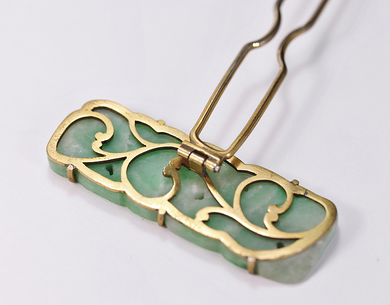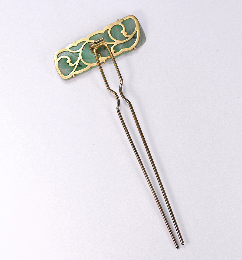 長方形の透かし彫刻を飾ったシンプルなかんざし。おおらかな様子の植物模様が趣きです。金具にはゴールドプレートを施し、裏坐の透かし細工等で高級感を感じさせる豪華さを演出しています。