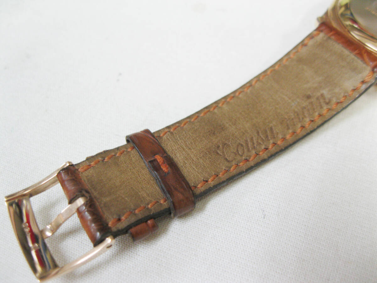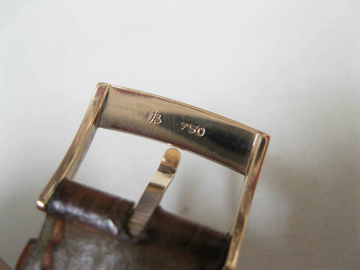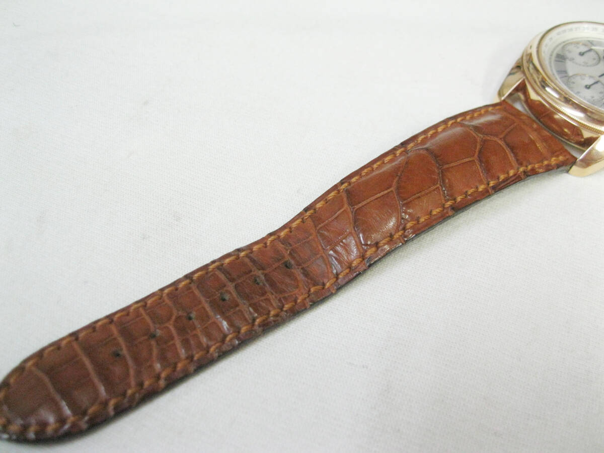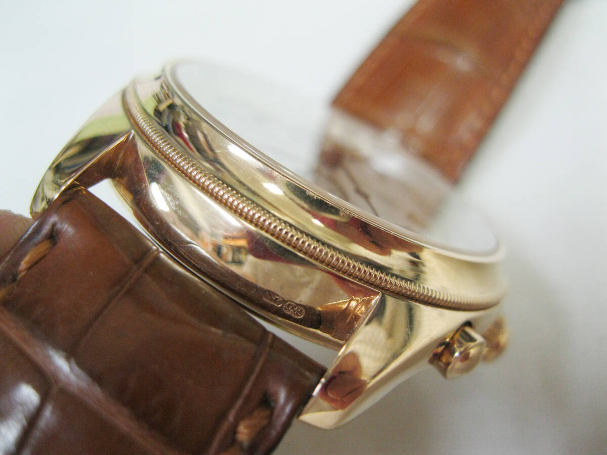 少し前の商品ですが使用回数少ないため細かい傷、汚れはありますが目立つ傷、汚れなどない綺麗な商品です。K18無垢(ベルト外して本体の重さ約69,2g),クロコベルトです。重みがある絶品です。写真でご確認ご判断下さい。動作(自動巻き)確認済みです。サイズ約37mm(竜頭含まず)です。付属品はありません。落札代金+送料です。ノークレーム、ノーリターンでお願い致します。落札後取引ナビで連絡お願いいたします。