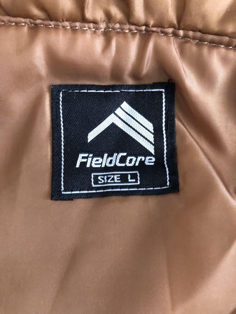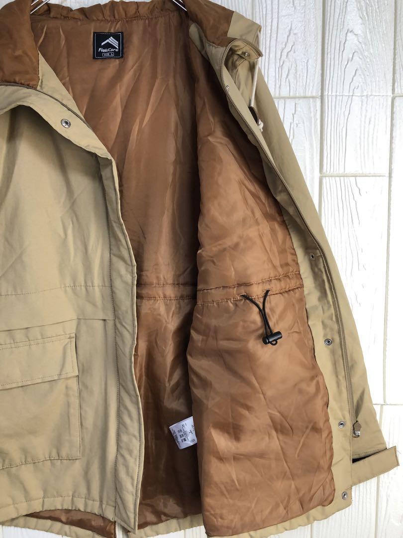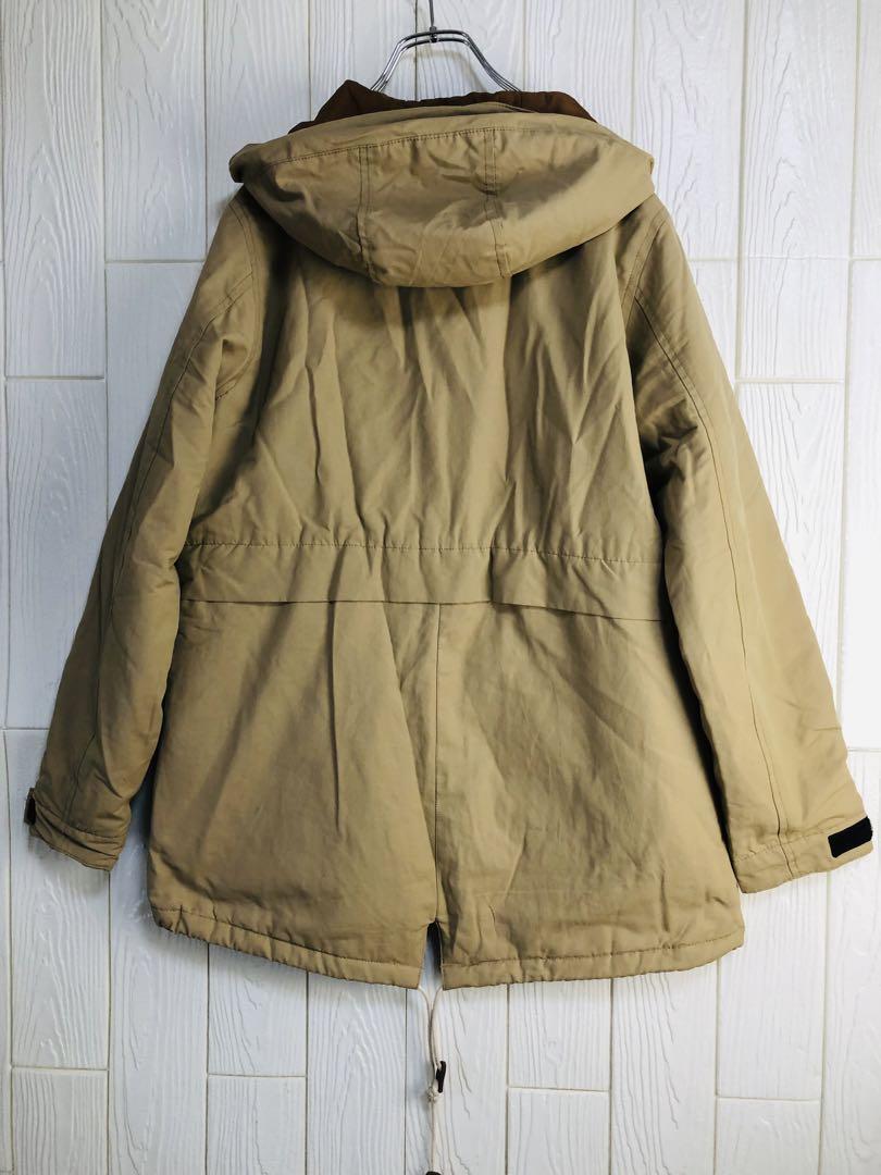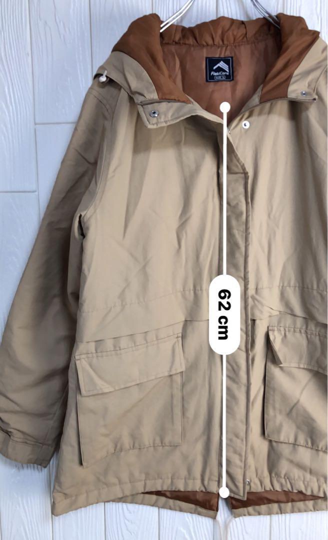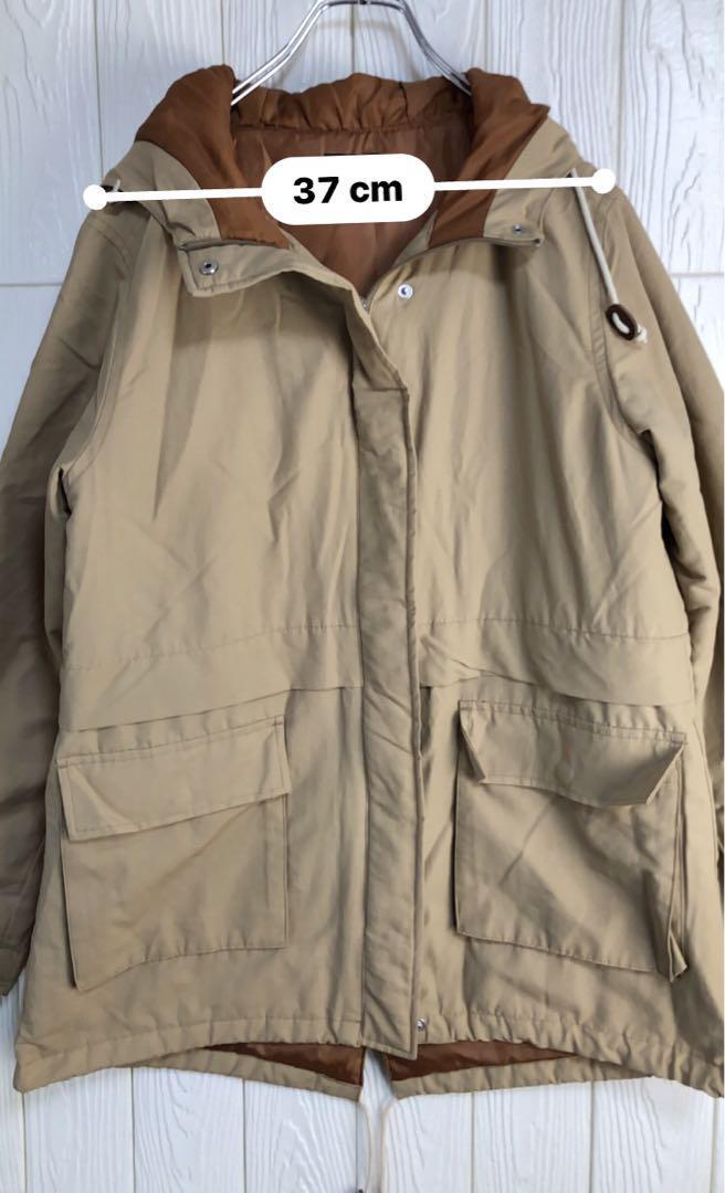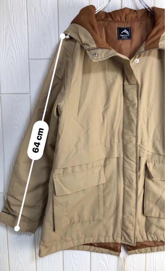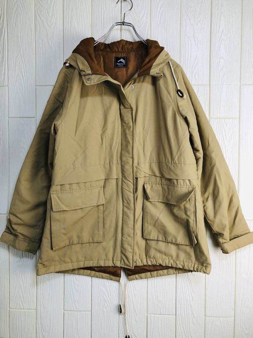 ベージュとブラウンの配色、調整可能なフードと大きなポケットが特徴のマウンテンパーカー。