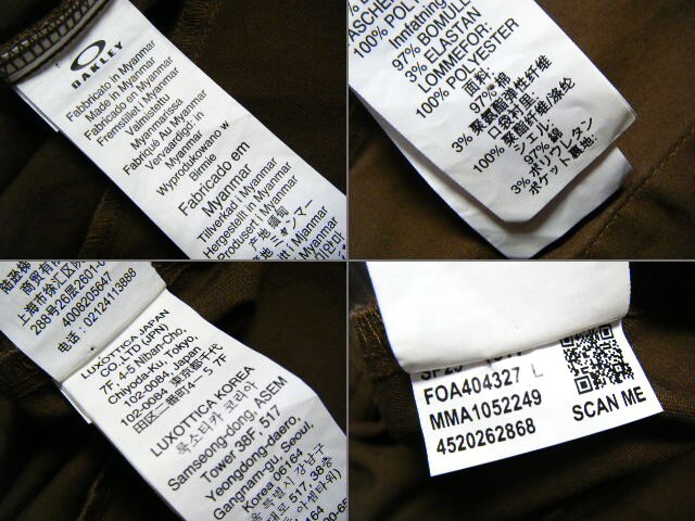 本体は綿、ポリエステル素材。   耐久性のある少し厚めのチノクロス調生地に、ストレッチ機能とドライ機能を持ち合わせたアウトドア&リゾート&カジュアル用高機能ショートパンツ・ハイブリッドショーツ。      アウトドアシーンからリゾート、タウンユースに幅広く着用可能なアイテム。   オークリー独自の HYDROLIX  モイスチャーマネジメントシステムが、パフォーマンスをサポート。    両サイドにポケットあり、右サイドポケット内には小物入れに便利なハンド(コイン)ポケット装備。  また、右ヒップはフラップ付きポケット。   左裾のロゴ文字はゴム樹脂貼り付け。  ドローコードの両先にロゴ文字プリントあり。    モデル名 OAKLEY MARINE PARK HIDRID 19° SHORT     カラー 茶色 / ブラウン