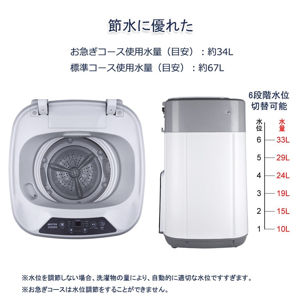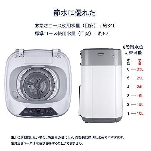【節水に優れた】6段階水位切替可能、1段から6段までの目安使用水量は10L〜33Lです。お急ぎコース使用水量:約34L 標準コース使用水量:約67L ※水位を調節しない場合、洗濯物の量により、自動的に適切な水位ですすぎます。お急ぎコースは水位調節をすることができません。
