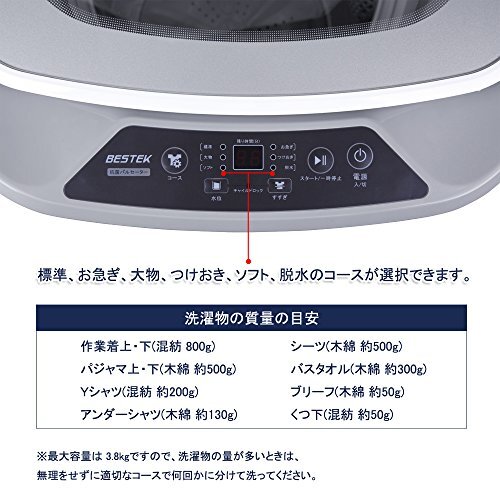 【13分お急ぎコース】汚れが少ないときなど、お急ぎコースを選択すれば、洗濯時間は約13分まで短縮できます。※洗濯所要時間は、水道水圧・排水条件により変わります。※最大容量は 3.8kgですので、洗濯物の量が多い時は、無理をせずに適切なコースで何回かに分けて洗ってください。標準、お急ぎ、大物、つけおき、ソフト、脱水 いずれのコースも選択できます。