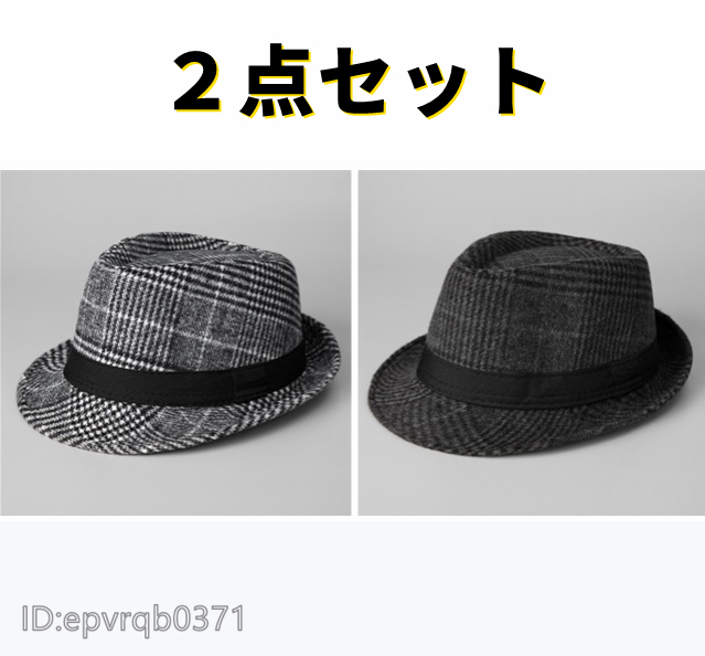 2点セット ソフト帽 新品 メンズキャップ ジャズハット チェック柄 紳士 帽子 中折れハット フリーサイズ 56-58センチ /グレー
